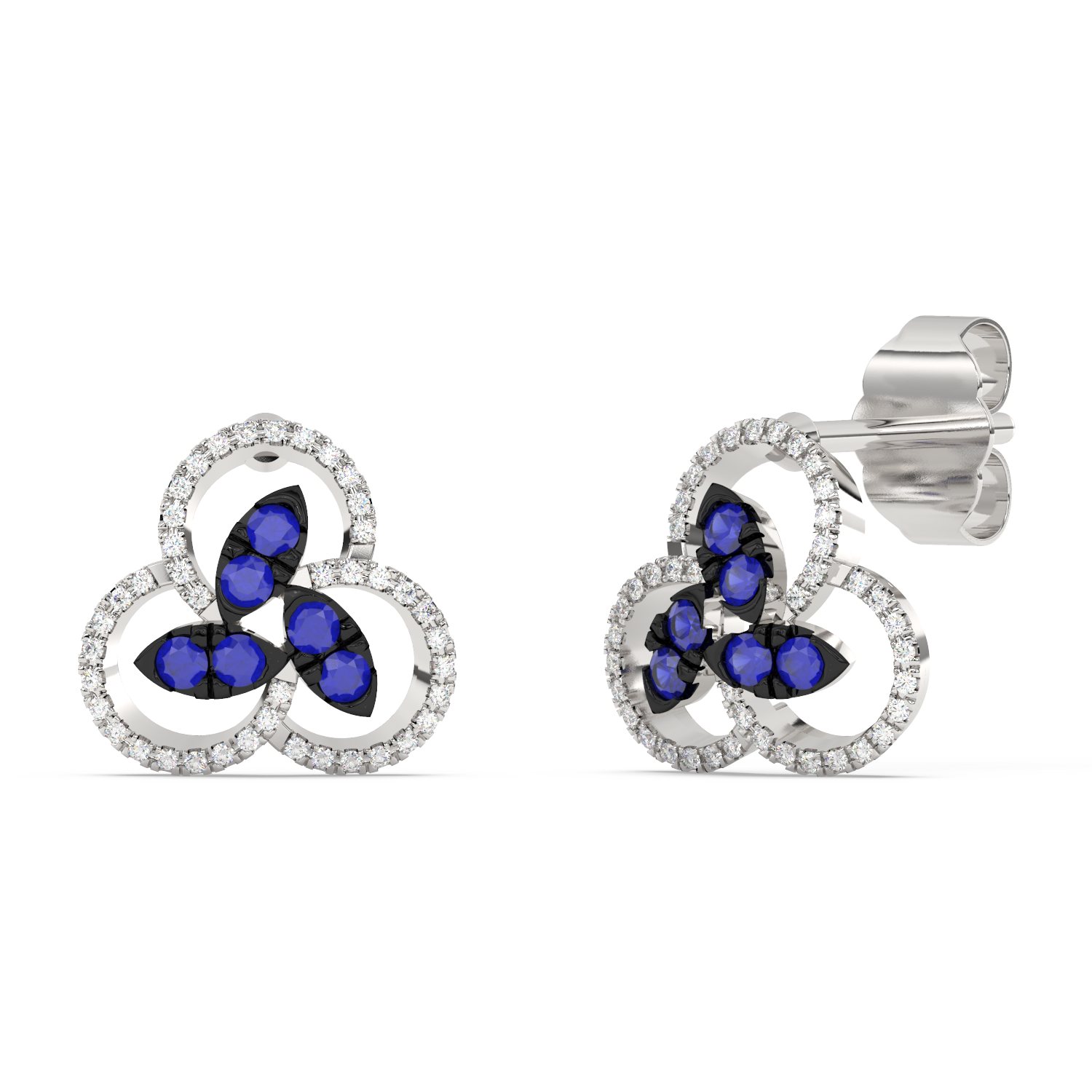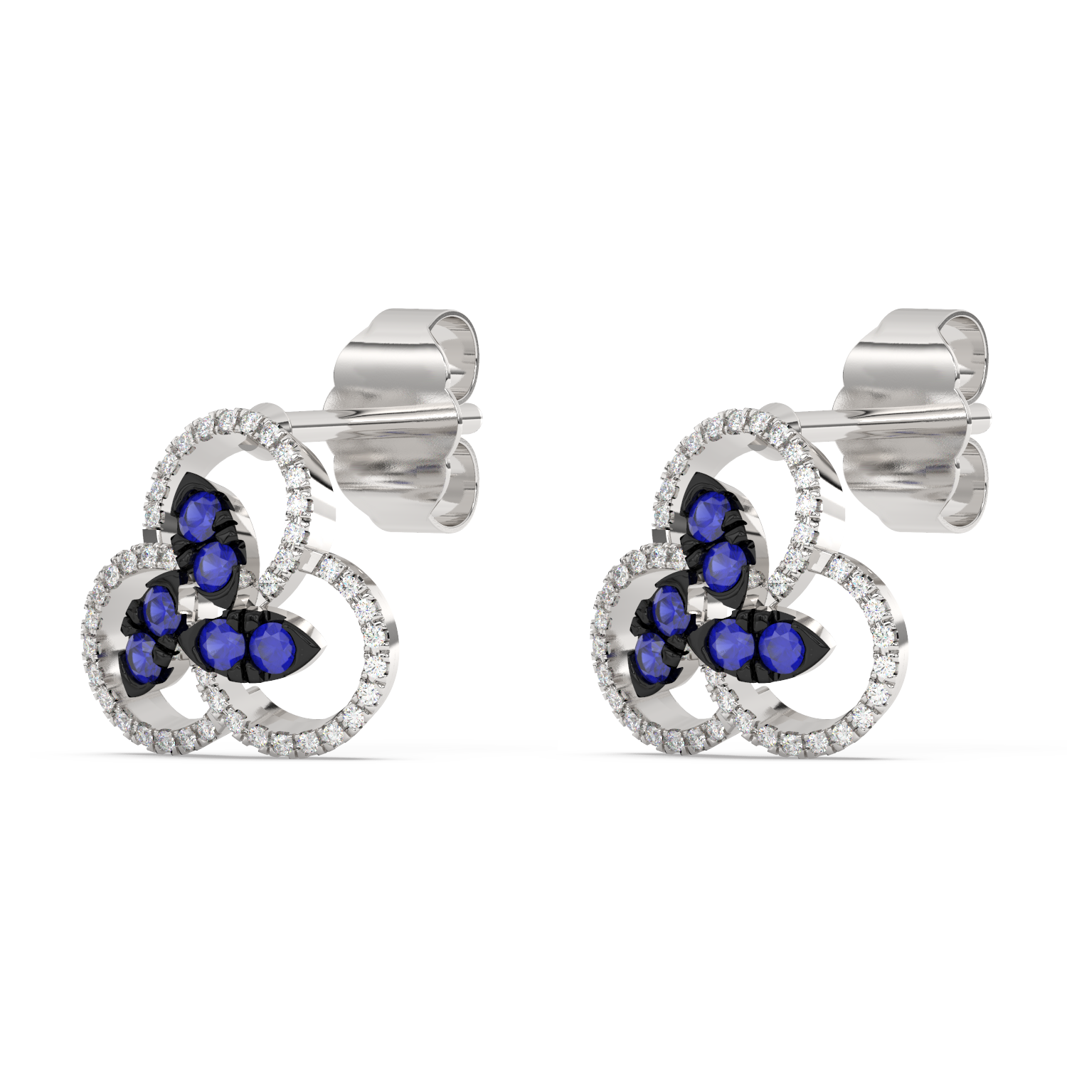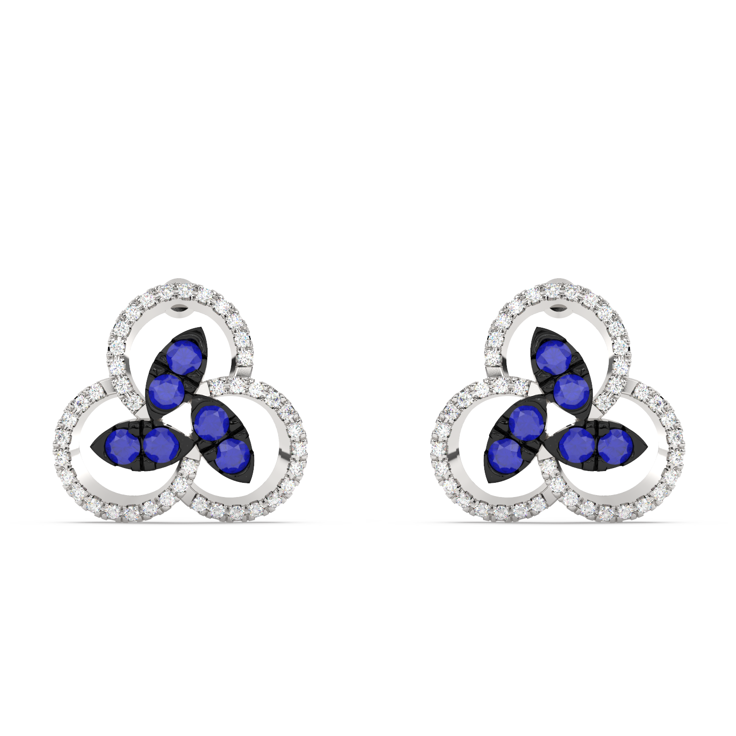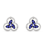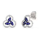 Kolczyki z niebieskimi szafirowymi płatkami, otoczonymi brylantowymi paskami o zaokrąglonym kształcie.