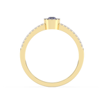 Złoty pierścionek halo z niebieskim szafirem w centrum, otoczonym brylantami oraz brylantowymi paskami po obu stronach obrączki.