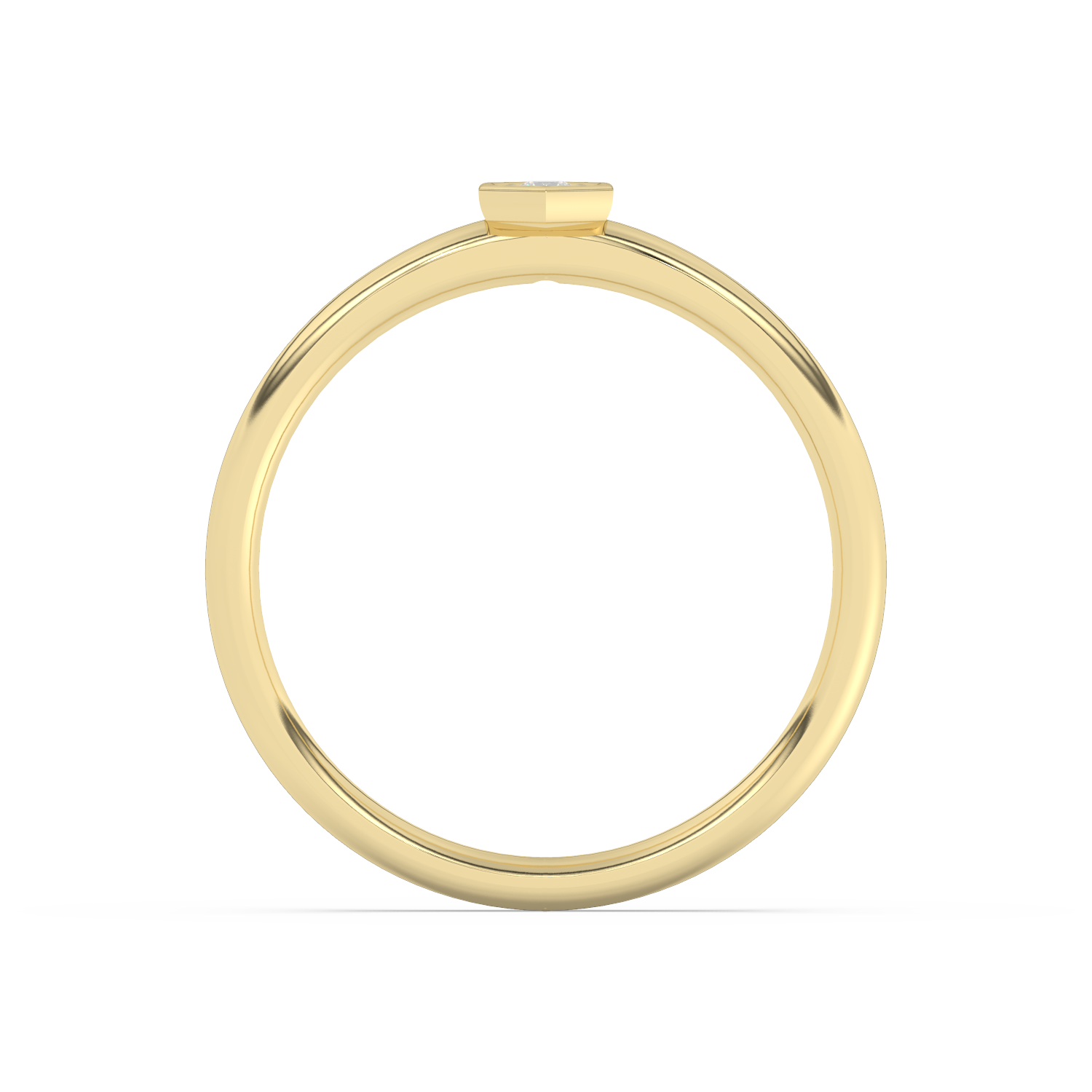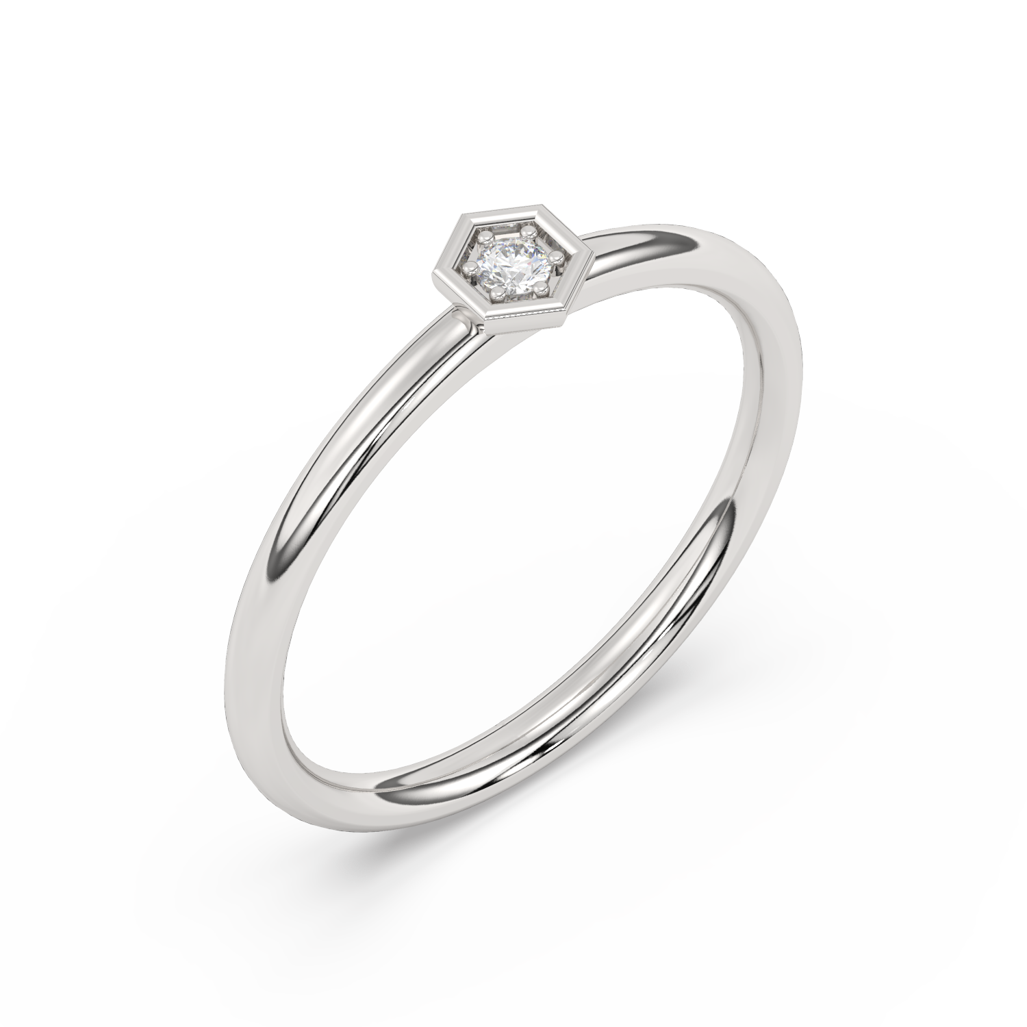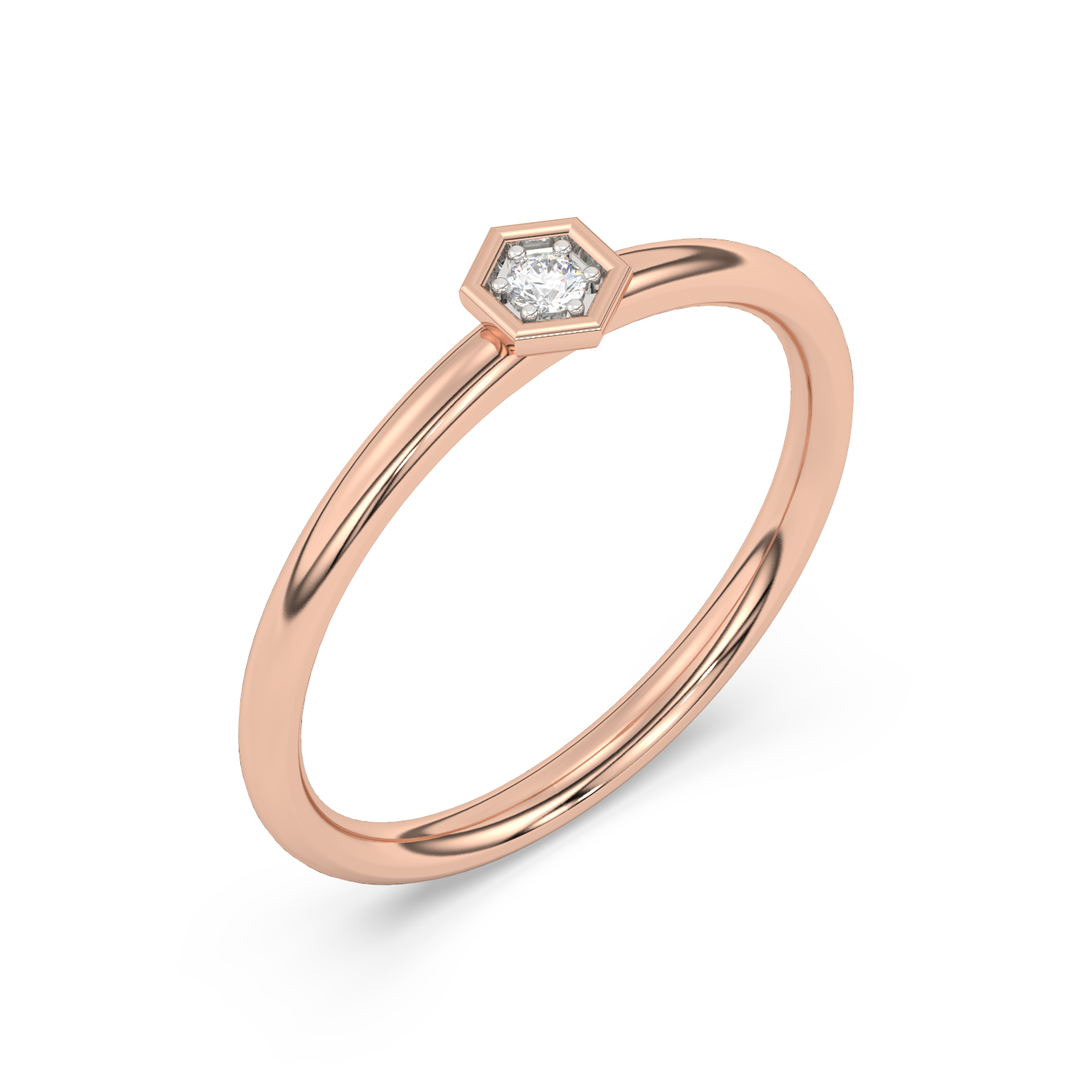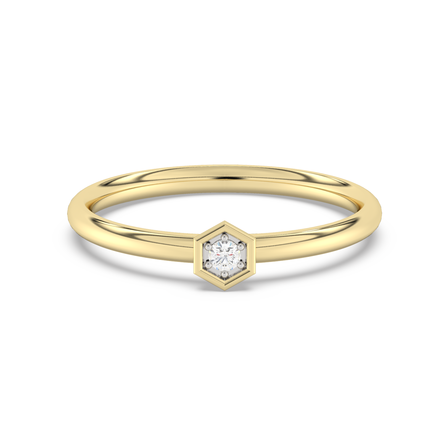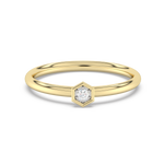 Złoty pierścionek w kształcie heksagonu z brylantem w centrum.