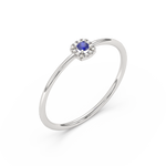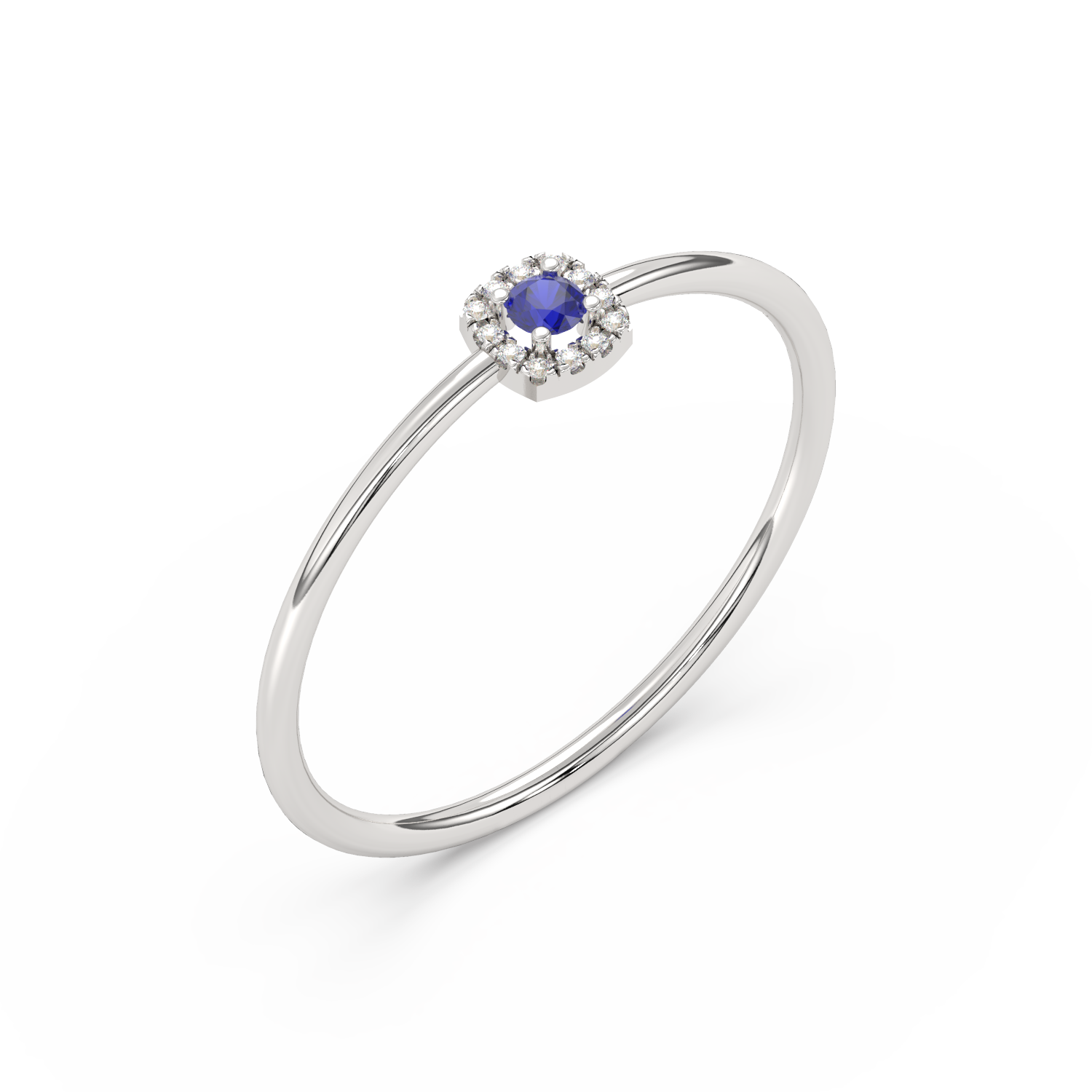 Delikatny pierścionek z niebieskim szafirem w centrum, otoczonym brylantami.