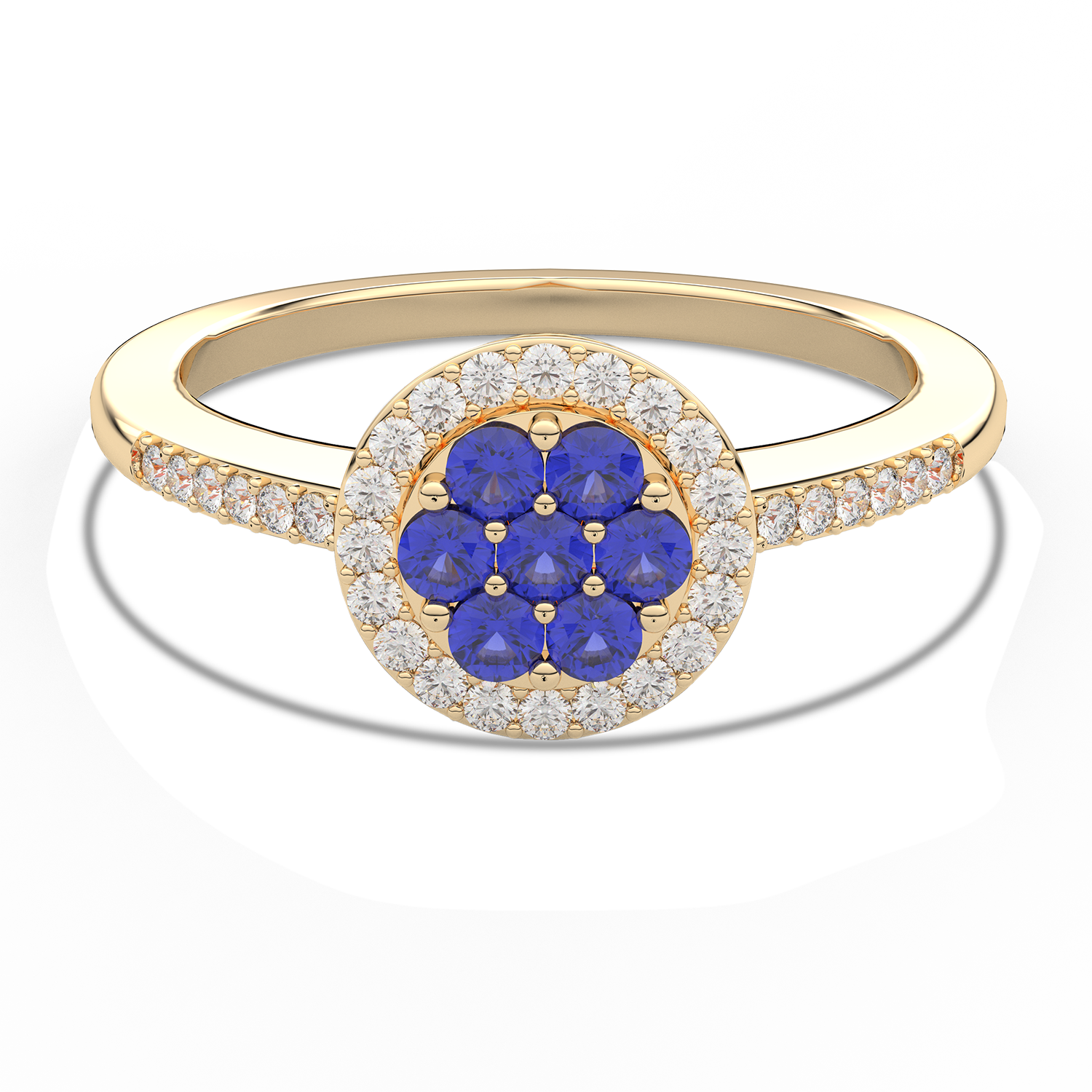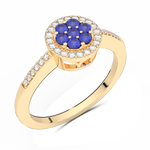 Piękny pierścionek z okrągłymi, polerowanymi, niebieskimi szafirami tworzącymi wzór kwiatu, otoczonymi paskiem okrągłych brylantów oraz paskiem brylantów na obrączce.