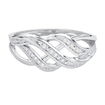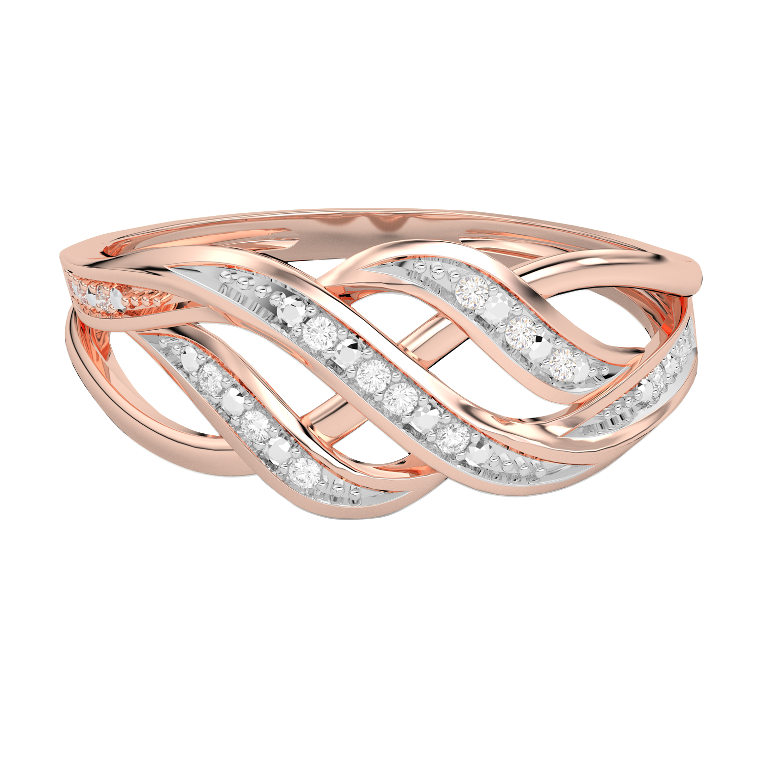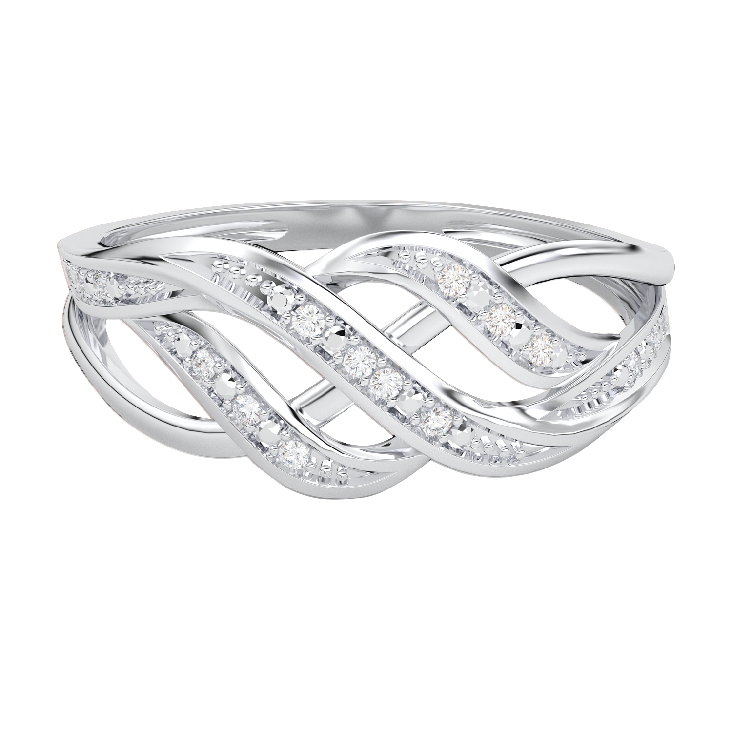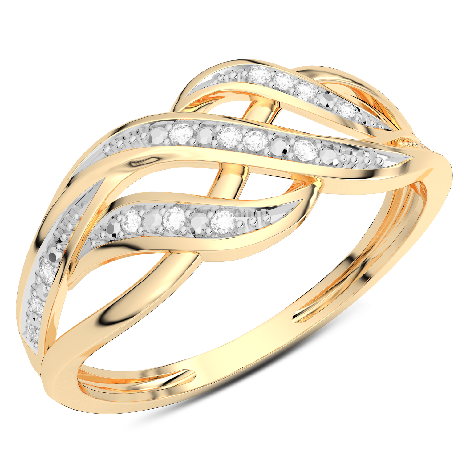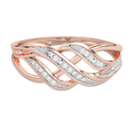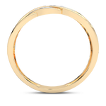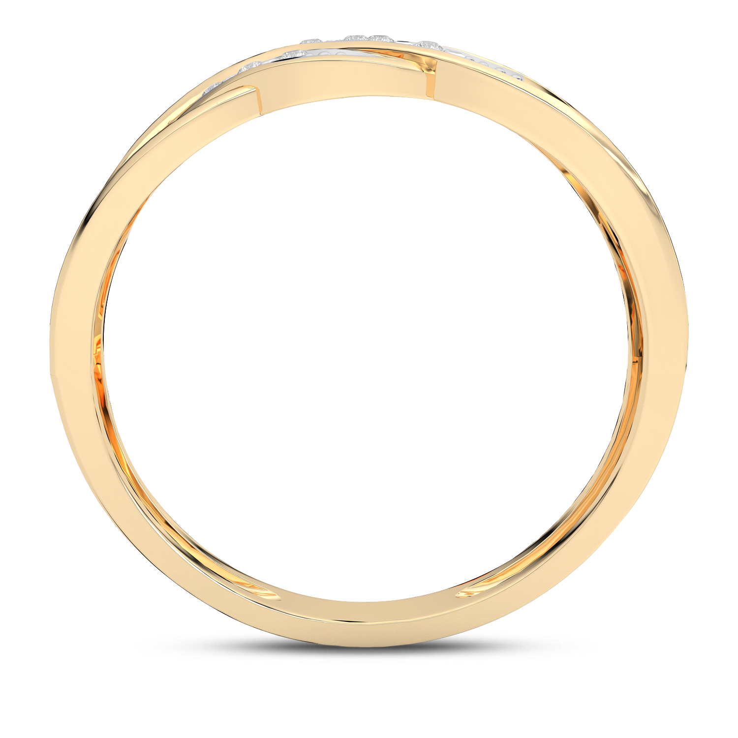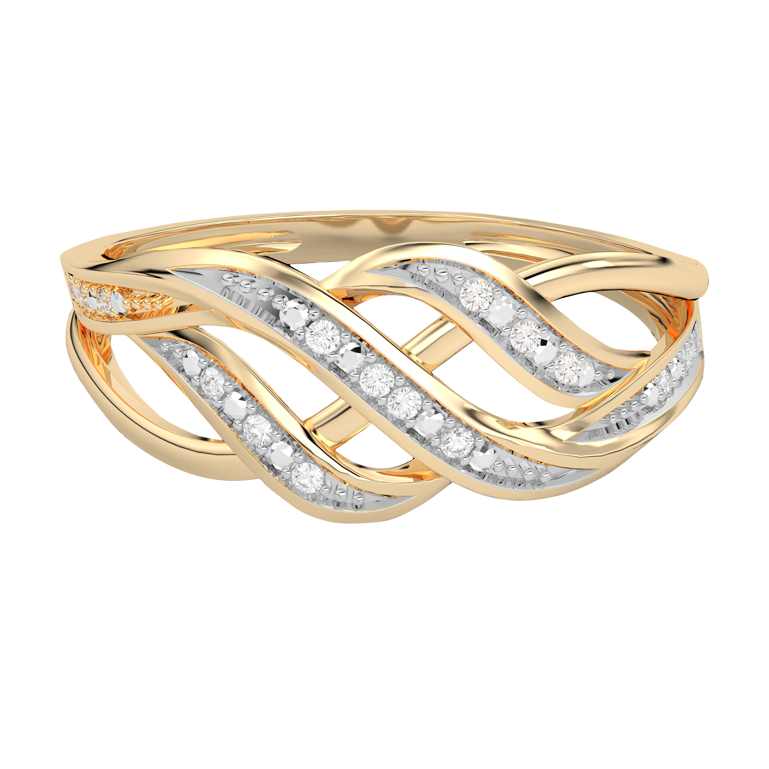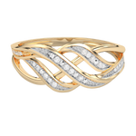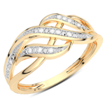 Elegancki pierścionek z przeplatającymi się brylantowymi paskami w centralnej części złotej obrączki.