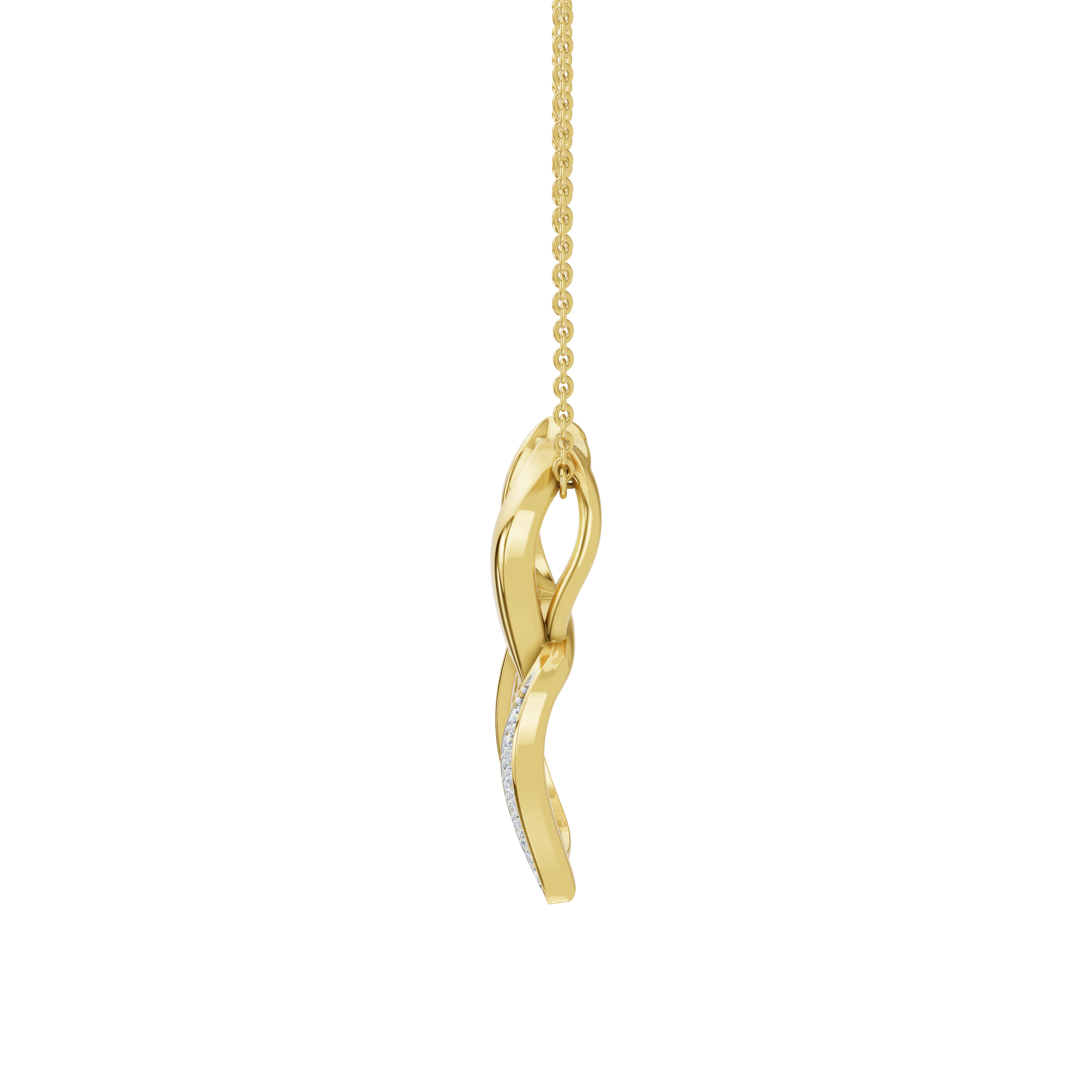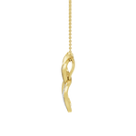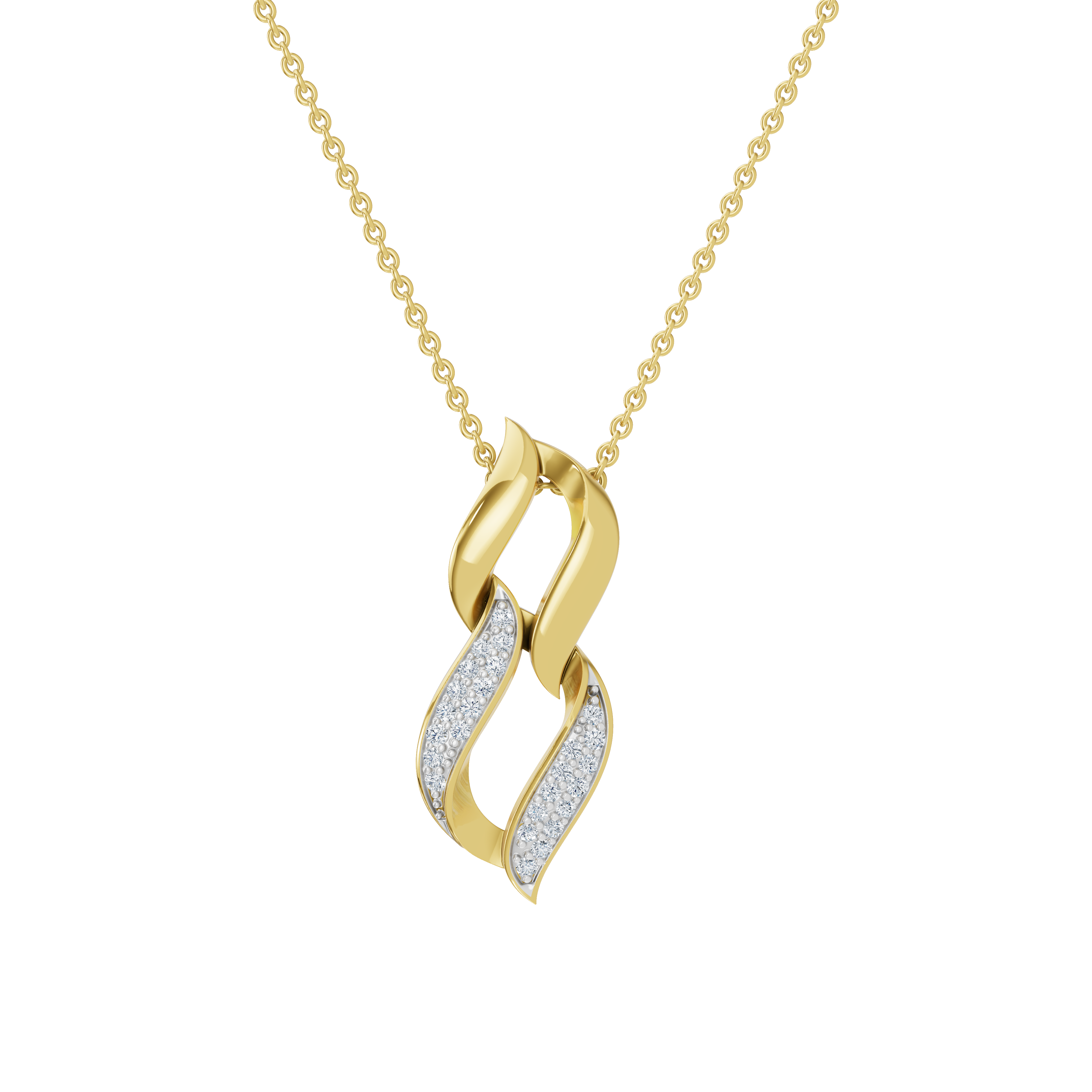 Nowoczesna i elegancka złota zawieszka o dynamicznej, falującej formie, która przyciąga uwagę subtelną grą linii i światła. Przeplatające się elementy tworzą harmonijną kompozycję, w której brylanty delikatnie podkreślają płynną sylwetkę biżuterii. Lekka, a zarazem wyrazista forma sprawia, że zawieszka pięknie układa się na szyi, dodając stylizacji nowoczesnej elegancji i kobiecego wdzięku. To doskonały wybór dla kobiet ceniących oryginalny design i ponadczasowy luksus. Łańcuszki sprzedawane oddzielnie.