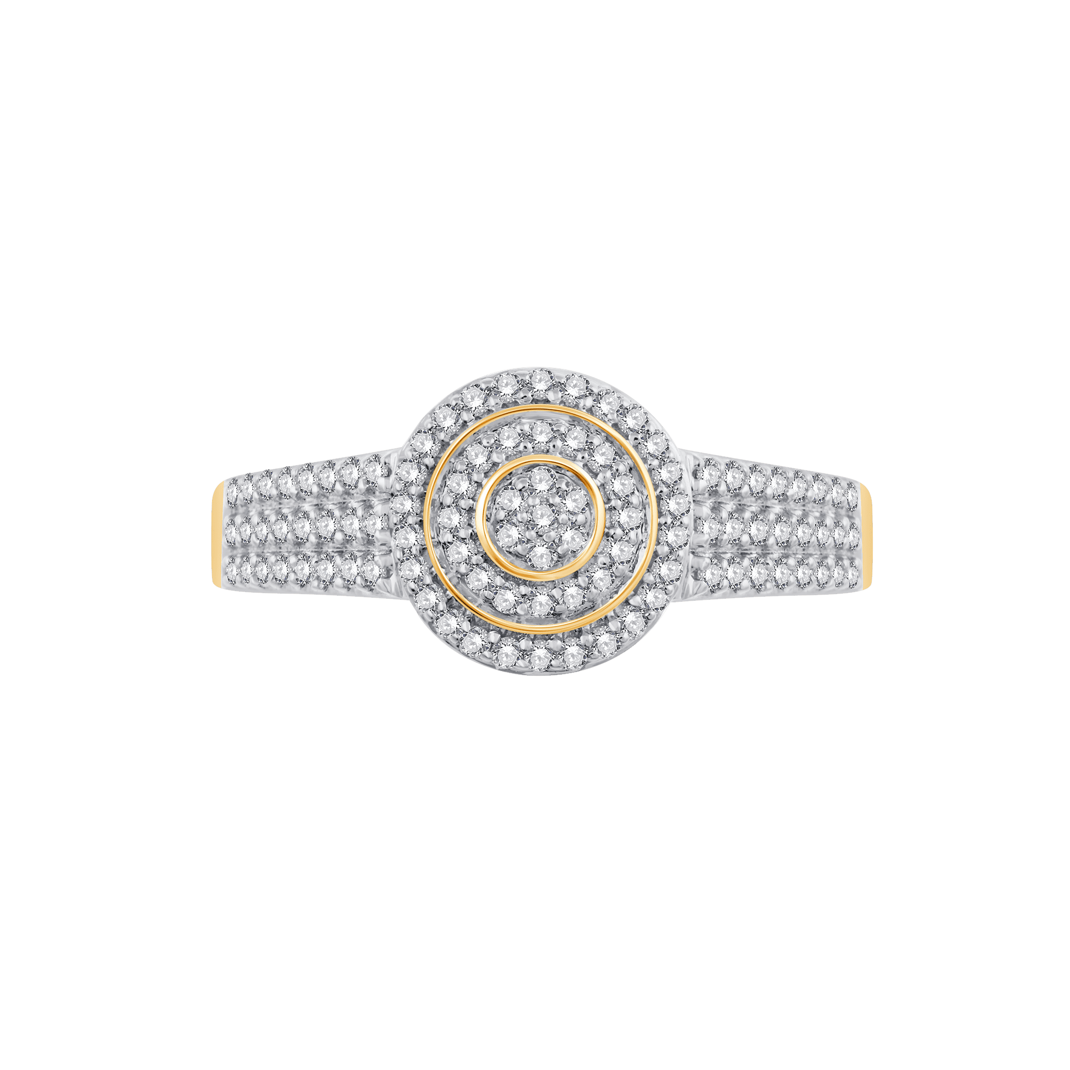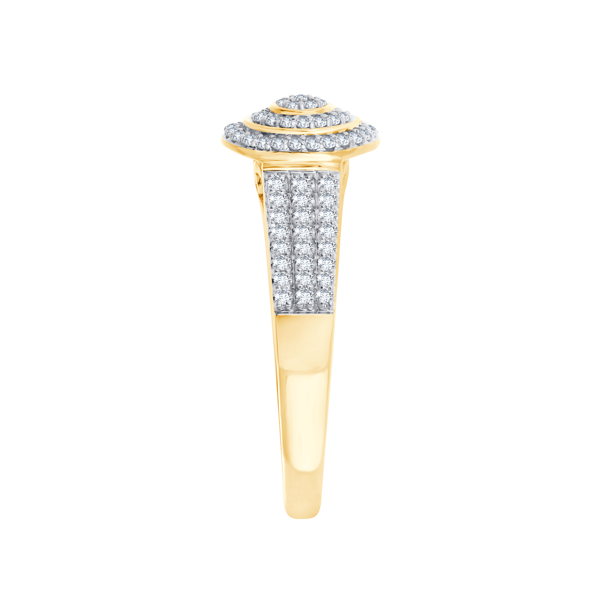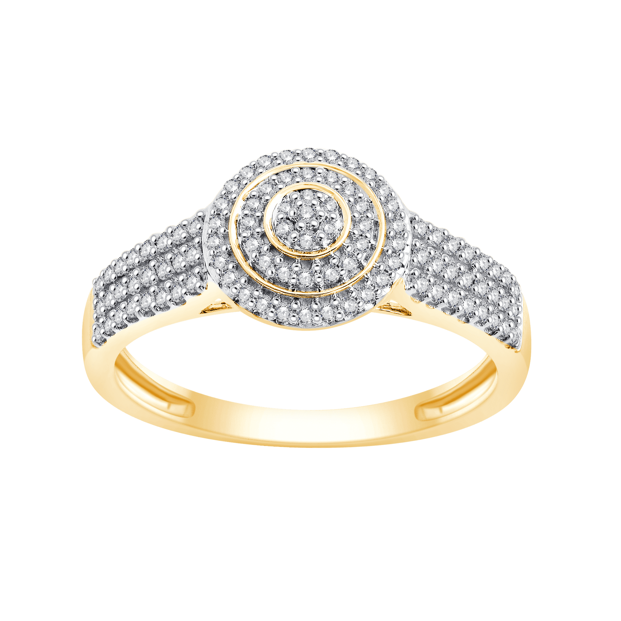 Elegancki złoty pierścionek, który zachwyca bogato zdobioną, okrągłą rozetą z brylantów. Centralna kompozycja została zaprojektowana w formie koncentrycznych kręgów, tworząc wrażenie głębi oraz spektakularnego rozświetlenia. Misternie wysadzane brylantami ramiona pierścionka harmonijnie łączą się z dekoracyjnym frontem, podkreślając luksusowy charakter biżuterii. To doskonała propozycja dla kobiety, która pragnie biżuterii wyrazistej, a jednocześnie pełnej klasy i ponadczasowej elegancji.