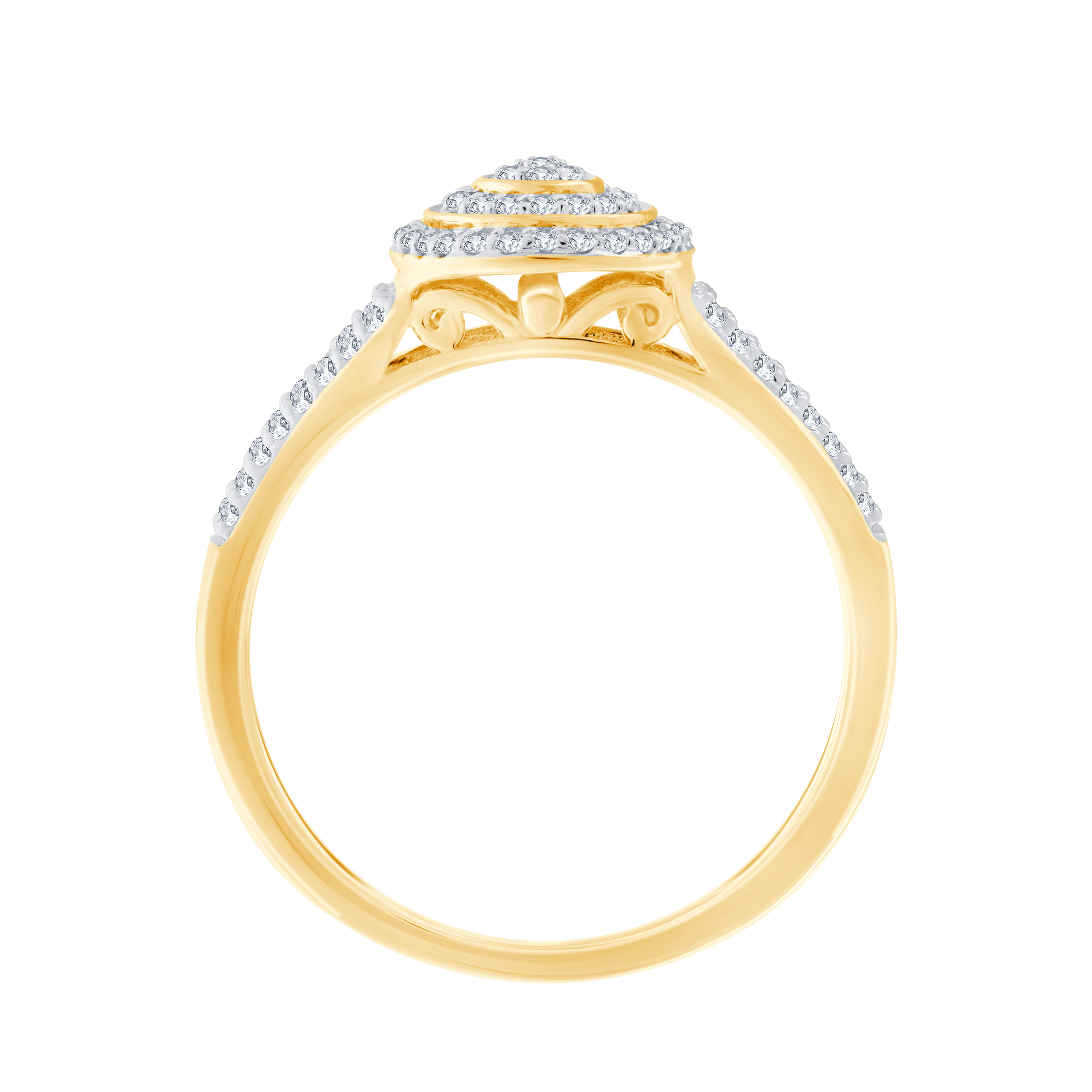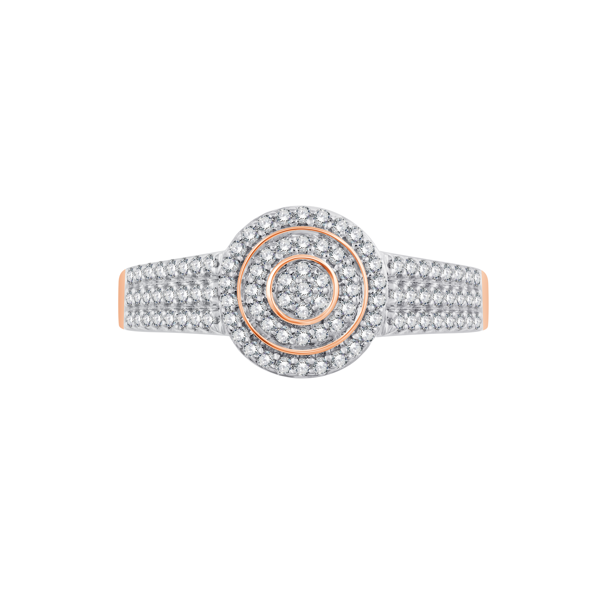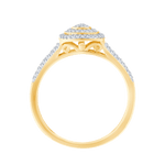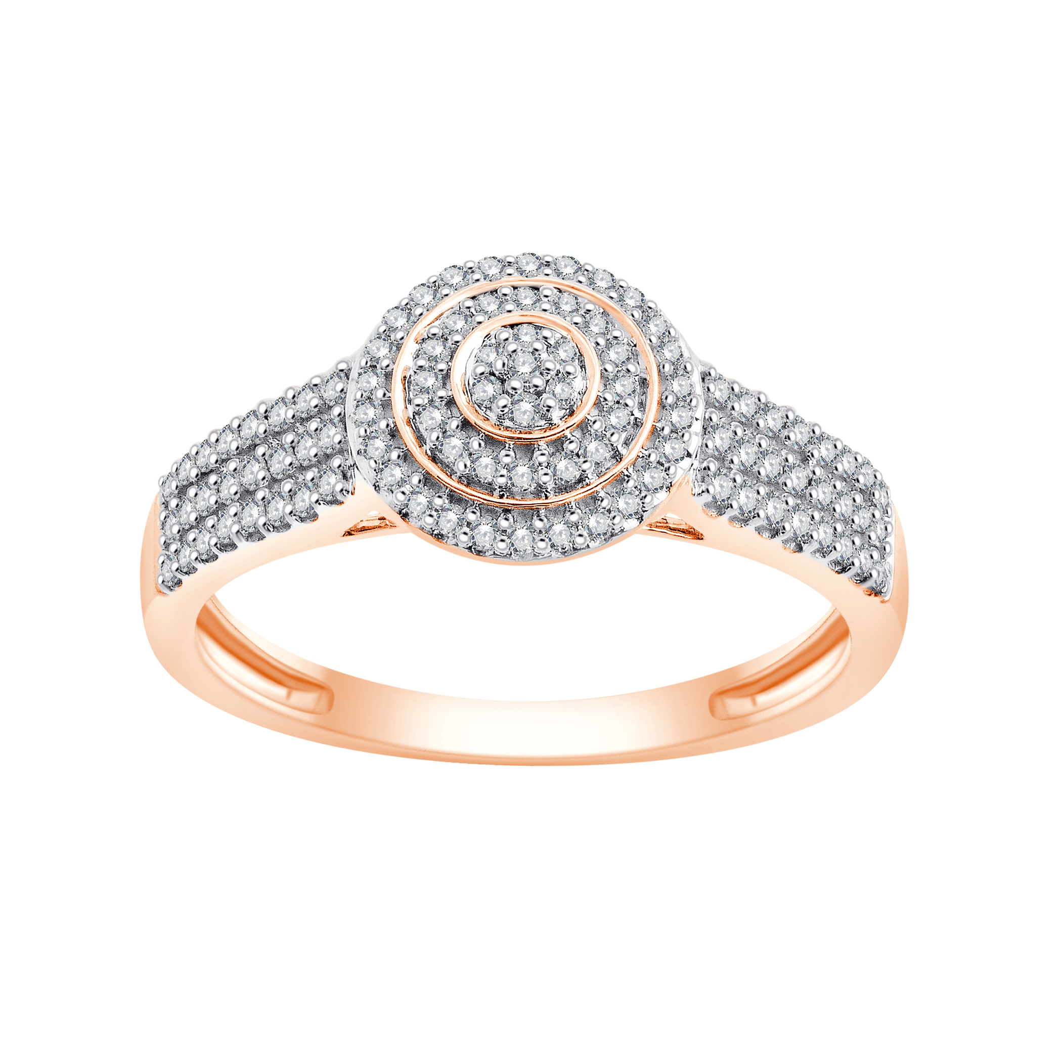Elegancki złoty pierścionek, który zachwyca bogato zdobioną, okrągłą rozetą z brylantów. Centralna kompozycja została zaprojektowana w formie koncentrycznych kręgów, tworząc wrażenie głębi oraz spektakularnego rozświetlenia. Misternie wysadzane brylantami ramiona pierścionka harmonijnie łączą się z dekoracyjnym frontem, podkreślając luksusowy charakter biżuterii. To doskonała propozycja dla kobiety, która pragnie biżuterii wyrazistej, a jednocześnie pełnej klasy i ponadczasowej elegancji.