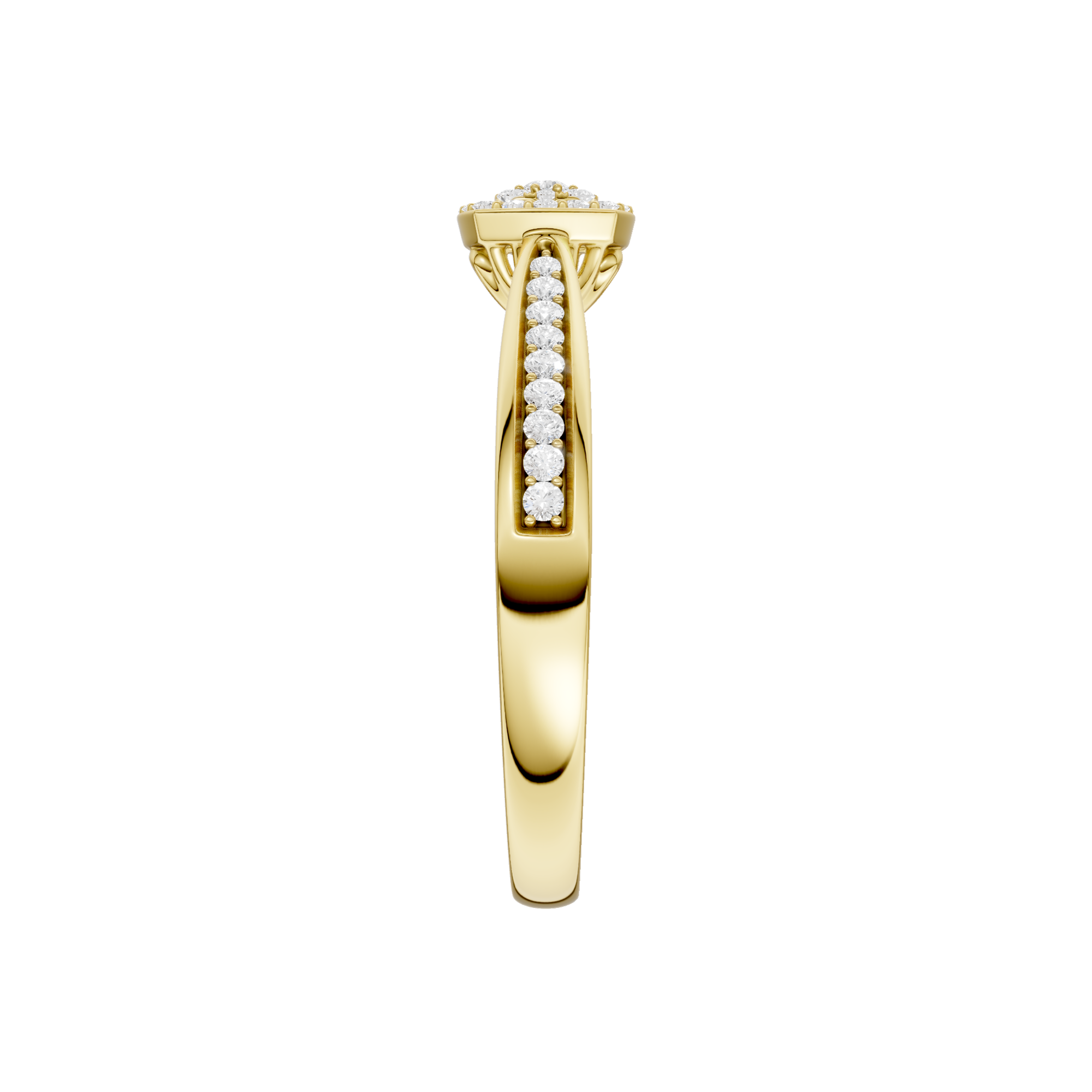 Ten elegancki pierścionek z żółtego złota pr. 585 to harmonijne połączenie klasyki i nowoczesnej formy. Centralna kompozycja z brylantów w delikatnym kształcie poduszki otoczona została halo z drobnych kamieni, które potęgują blask i tworzą subtelny efekt głębi. Smukła, zwężająca się ku górze szyna również ozdobiona została brylantami, co dodaje całości lekkości i wyrafinowania. Idealny wybór dla kobiet ceniących ponadczasową elegancję i dyskretny luksus.