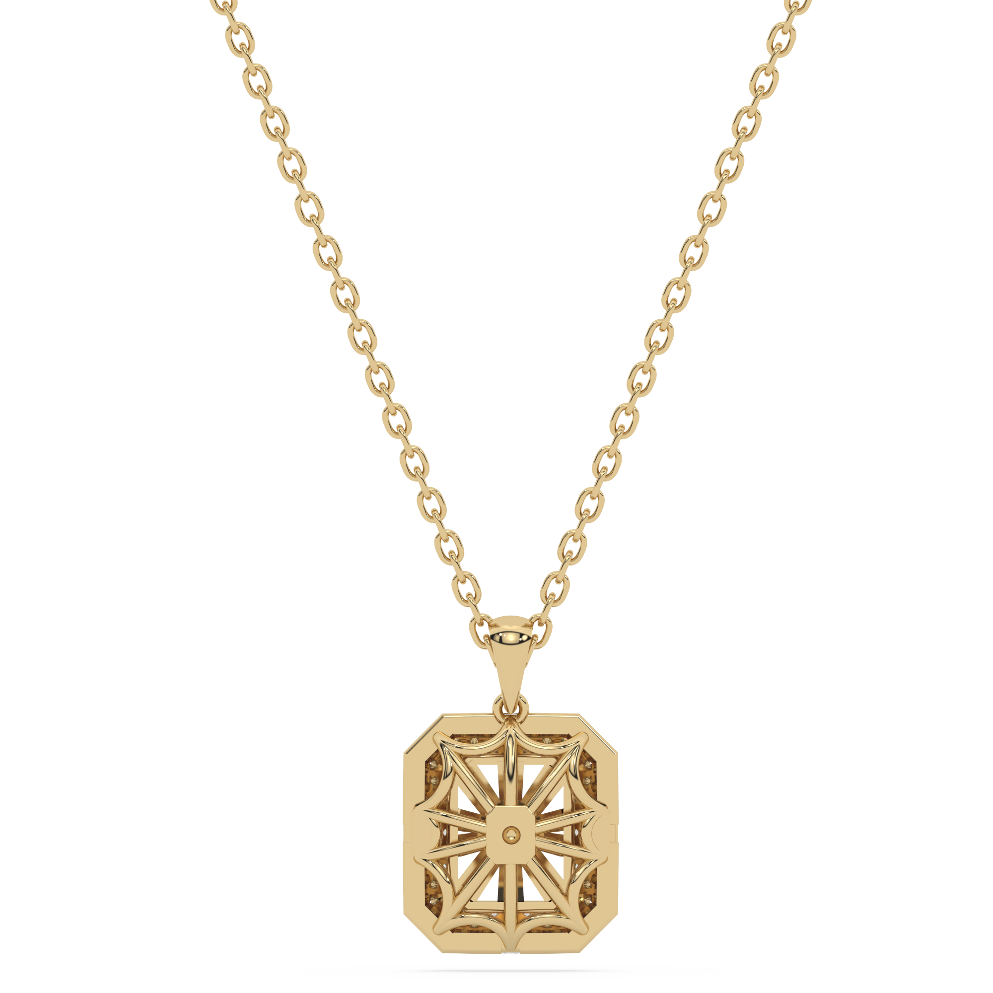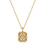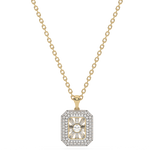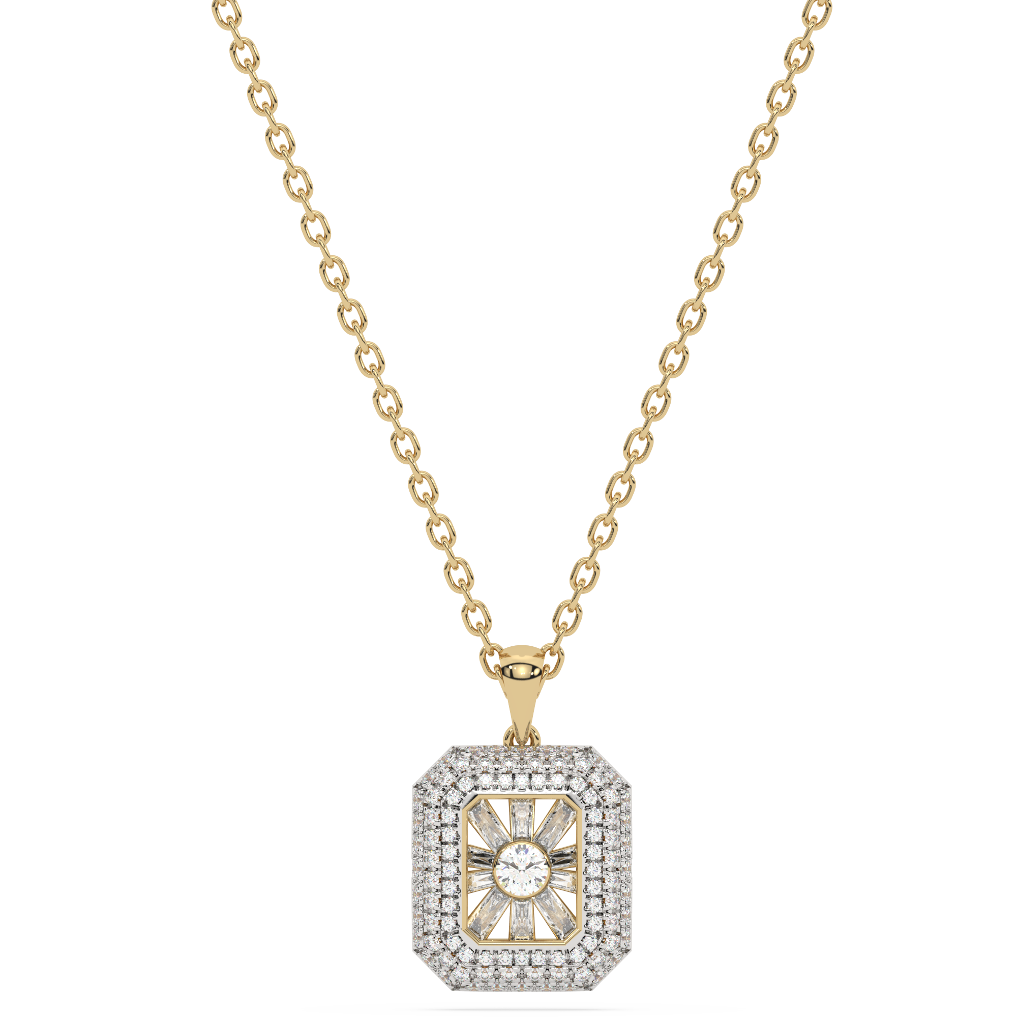Złota zawieszka o prostokątnej formie to wyrafinowana biżuteria pełna blasku. Centralny brylant otoczony jest kompozycją kamieni o szlifie bagietkowym, a całość dopełniają drobne brylanty w szlifie brylantowym i okrągłym, które tworzą efekt świetlistej aureoli. Zawieszka zachwyca harmonią kształtów i elegancją, dodając luksusowego charakteru każdej stylizacji. Łańcuszki sprzedawane oddzielnie.
