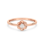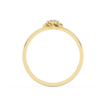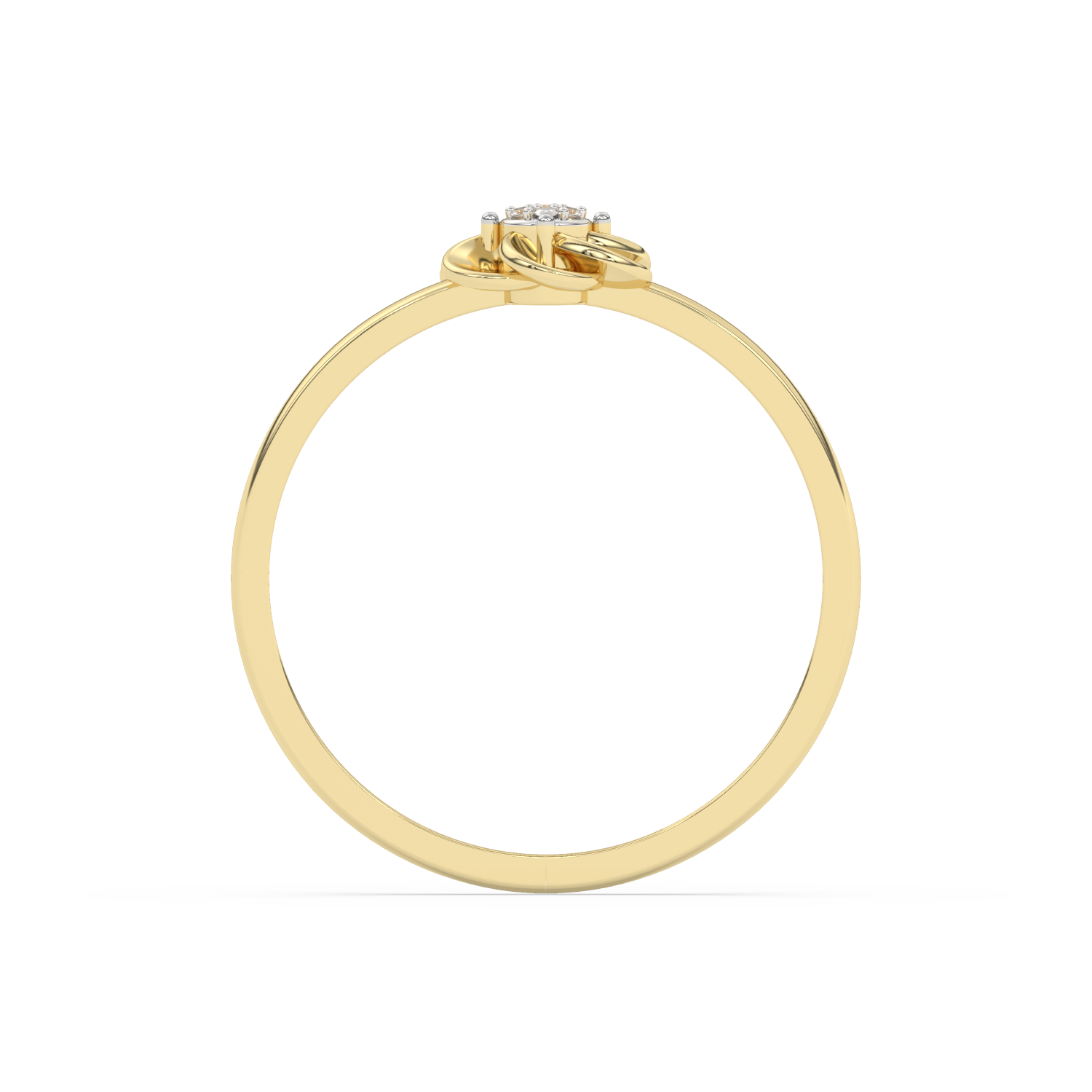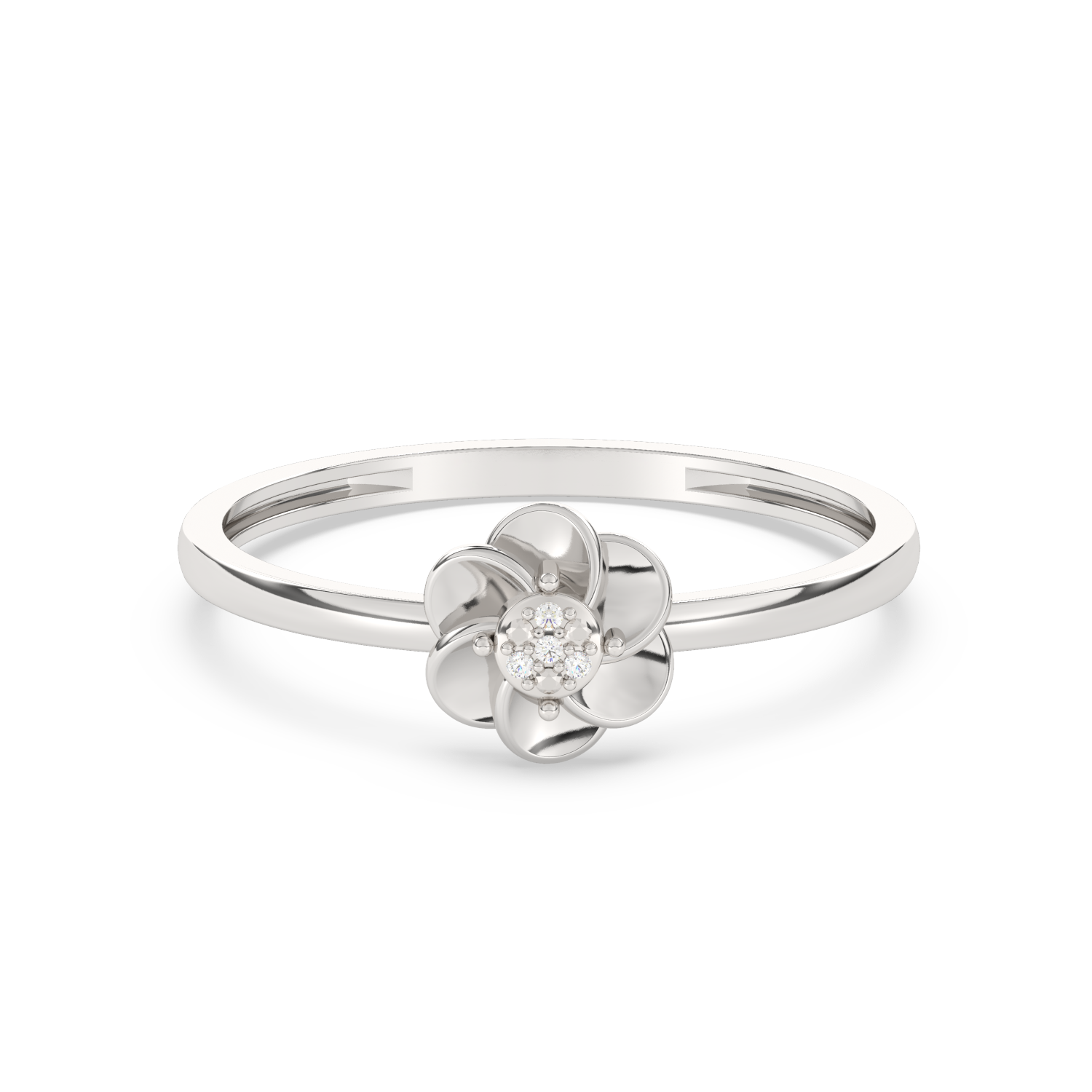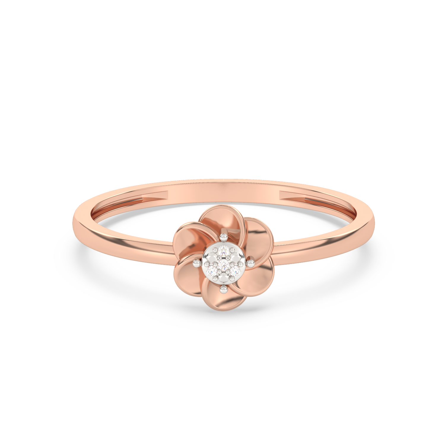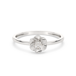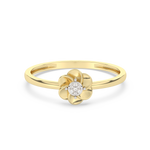 Delikatny złoty pierścionek w kształcie róży z sześcioma płatkami i czterema brylantami w centrum. W naszej ofercie posiadmy pasujące kolczyki.