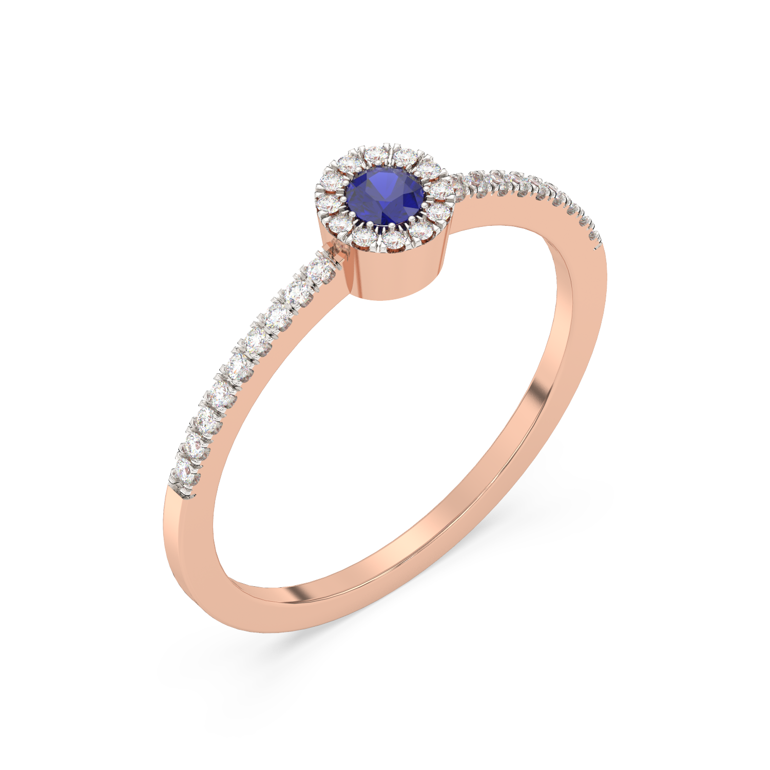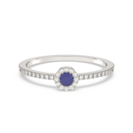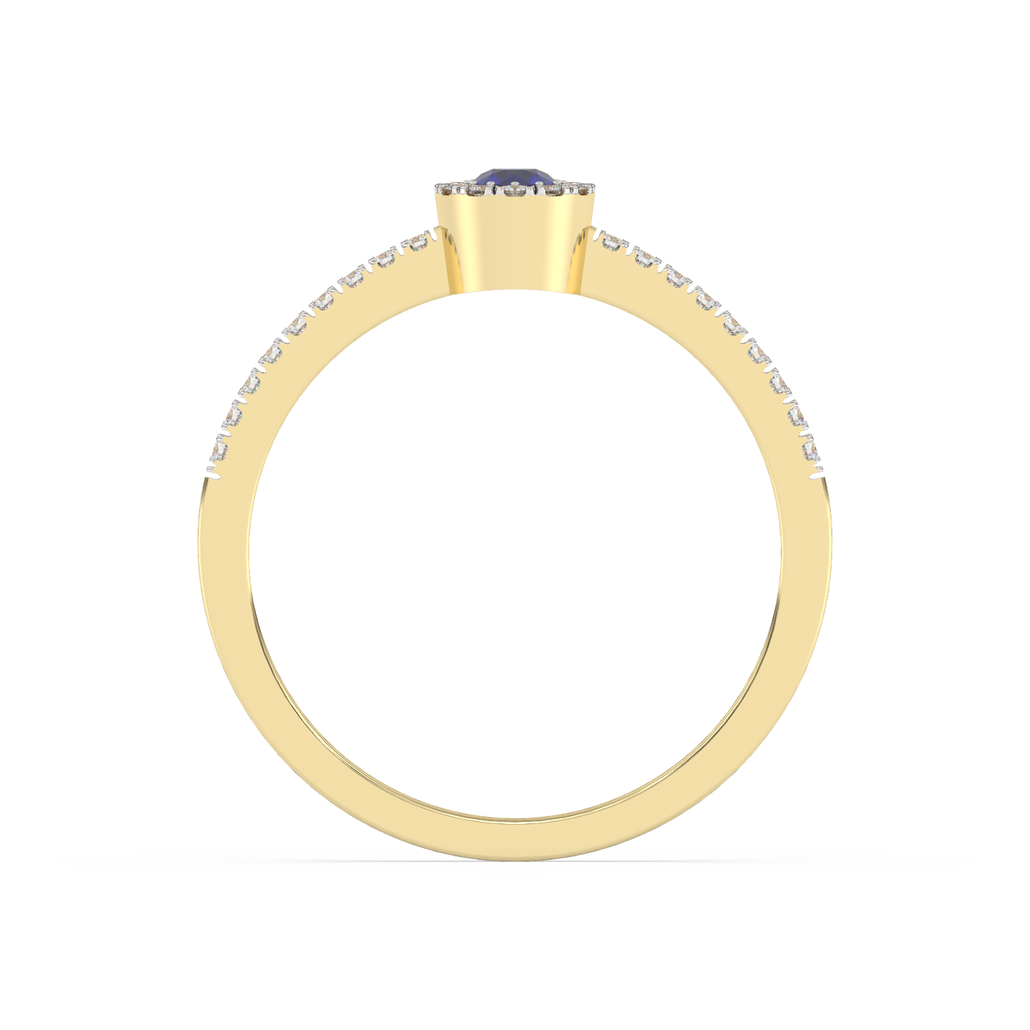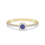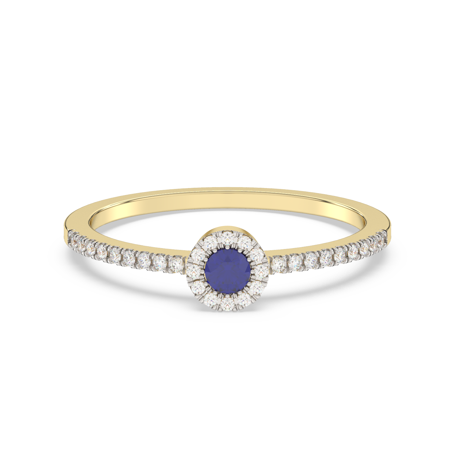A gold halo ring with a blue sapphire in the center, surrounded by diamonds and diamond bands on either side of the band.