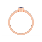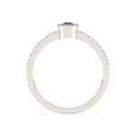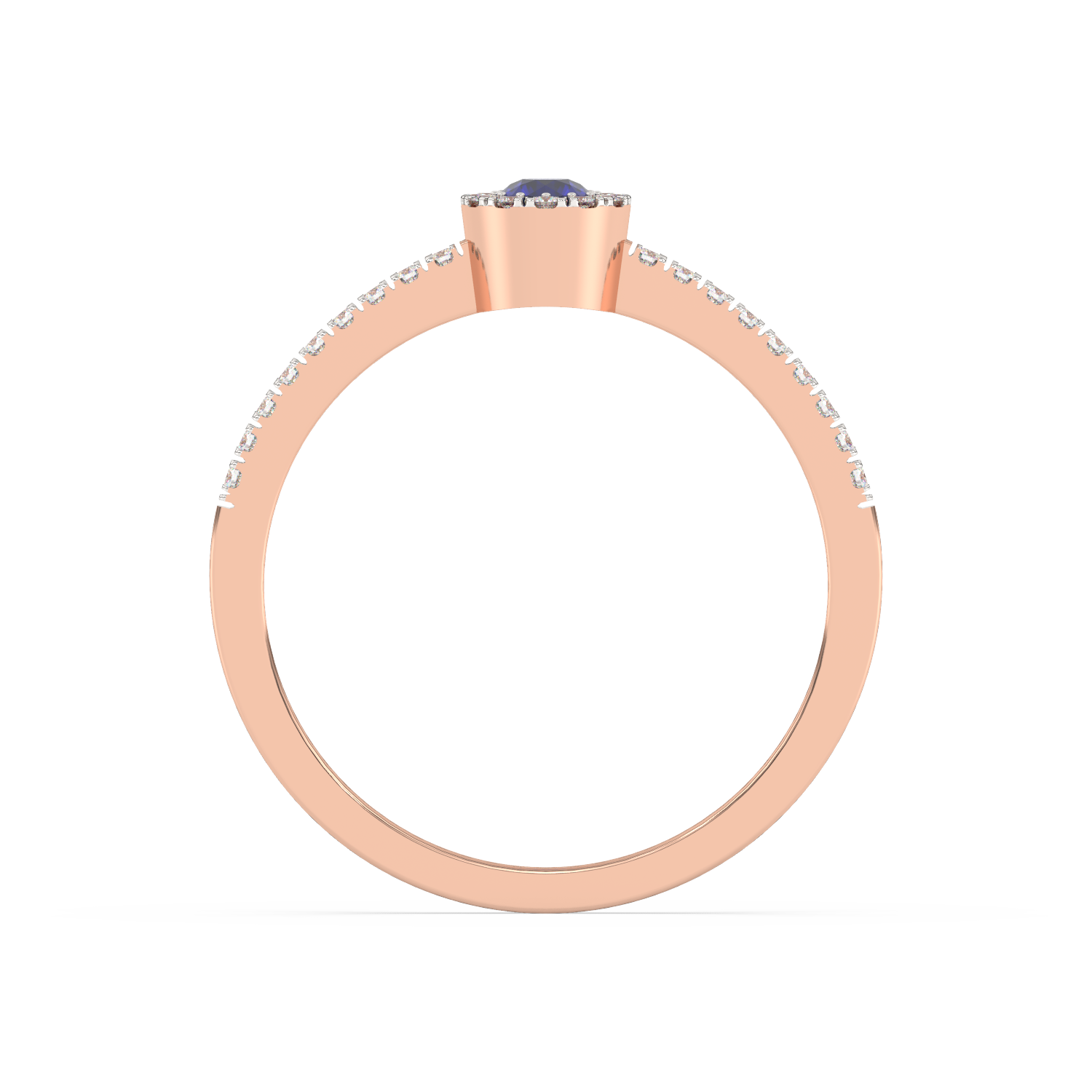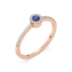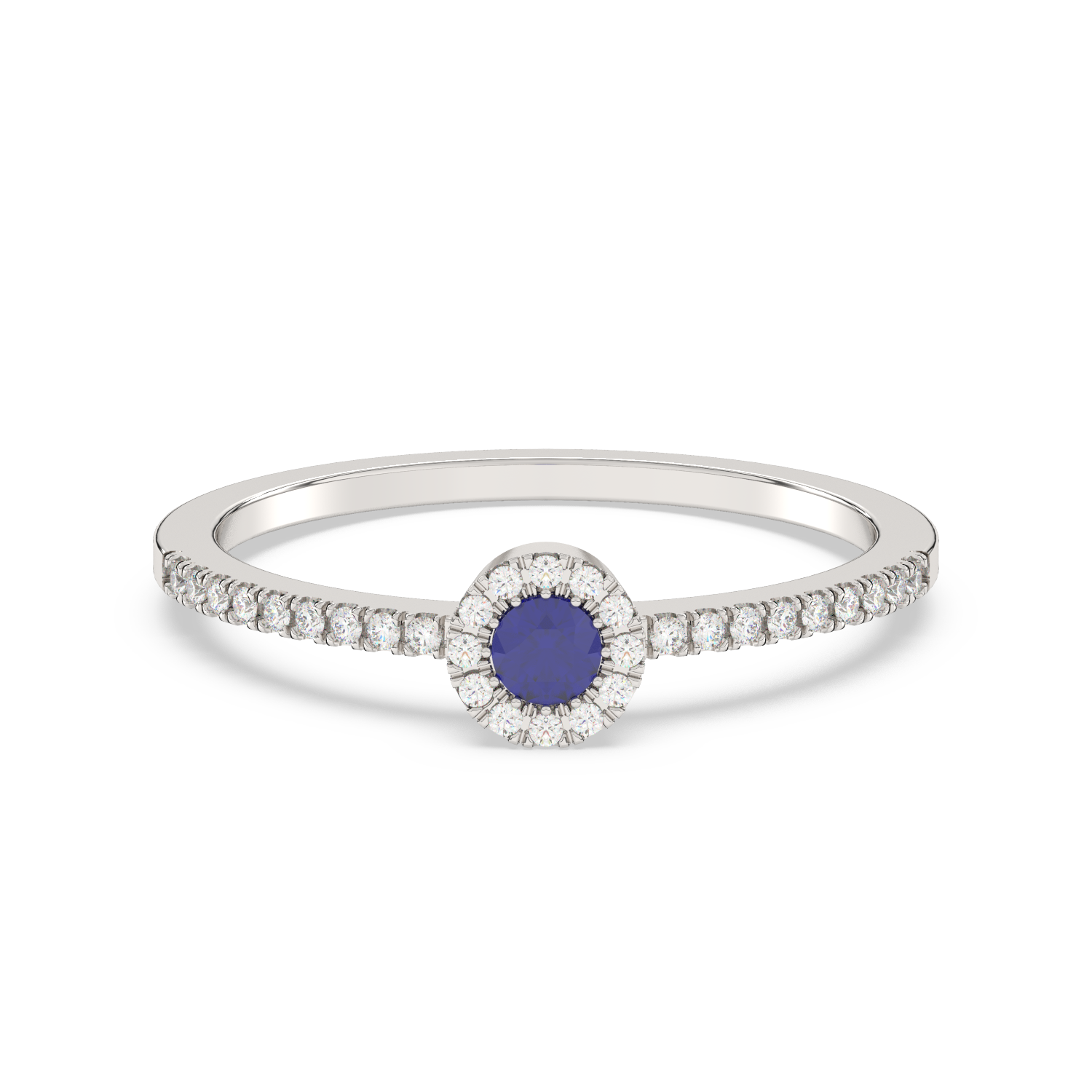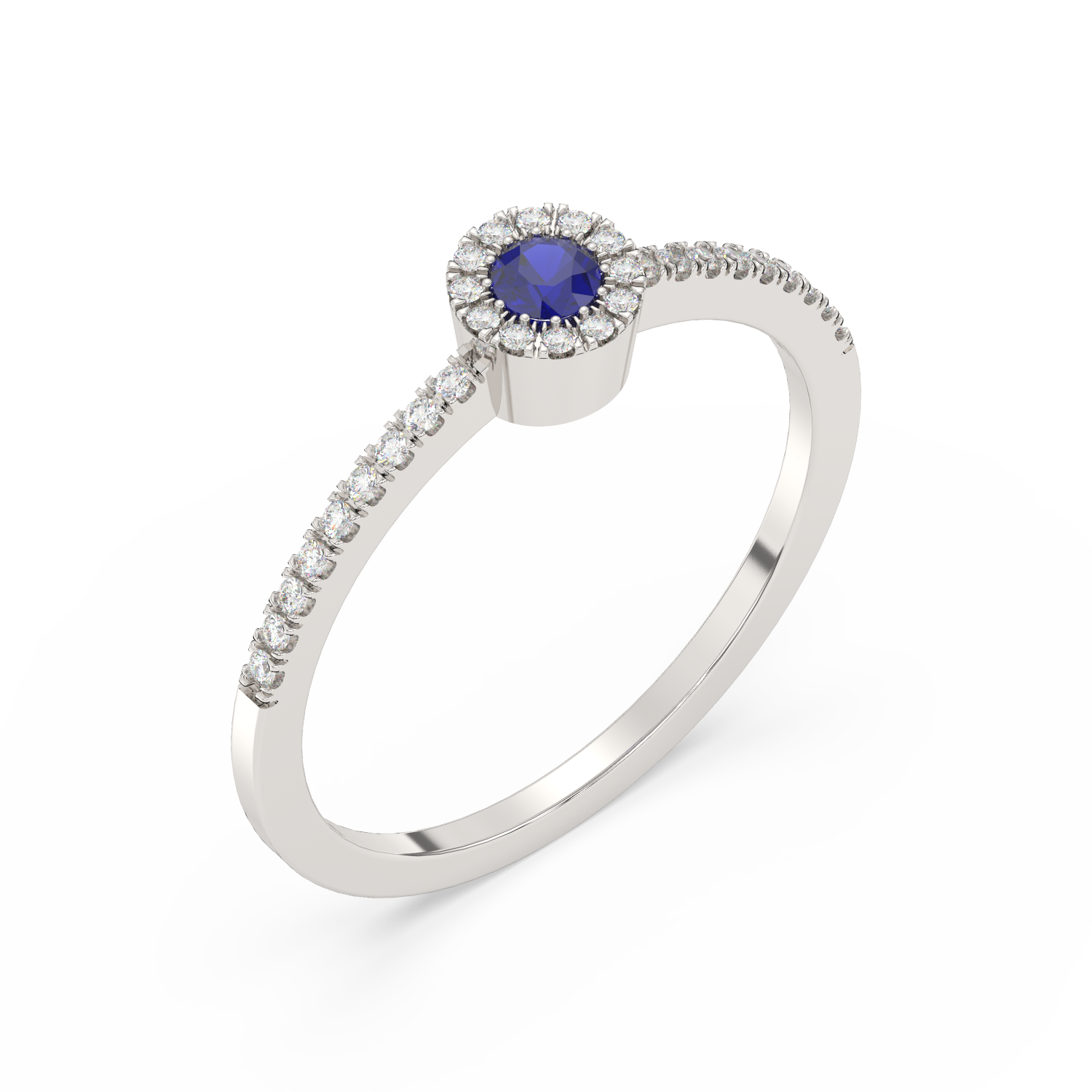 A gold halo ring with a blue sapphire in the center, surrounded by diamonds and diamond bands on either side of the band.