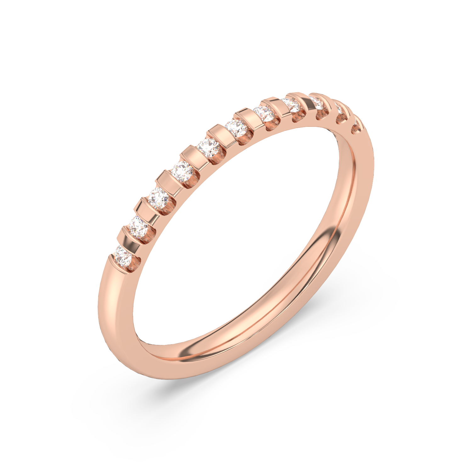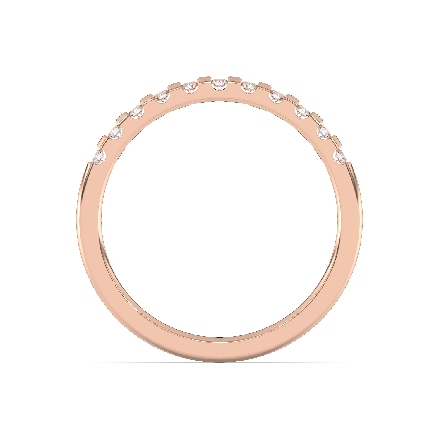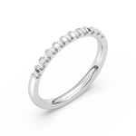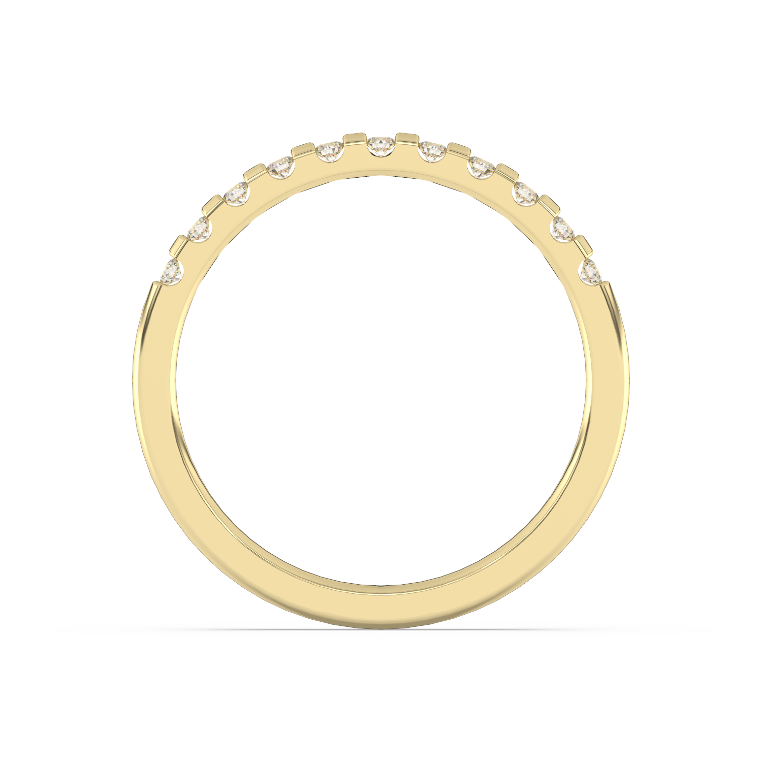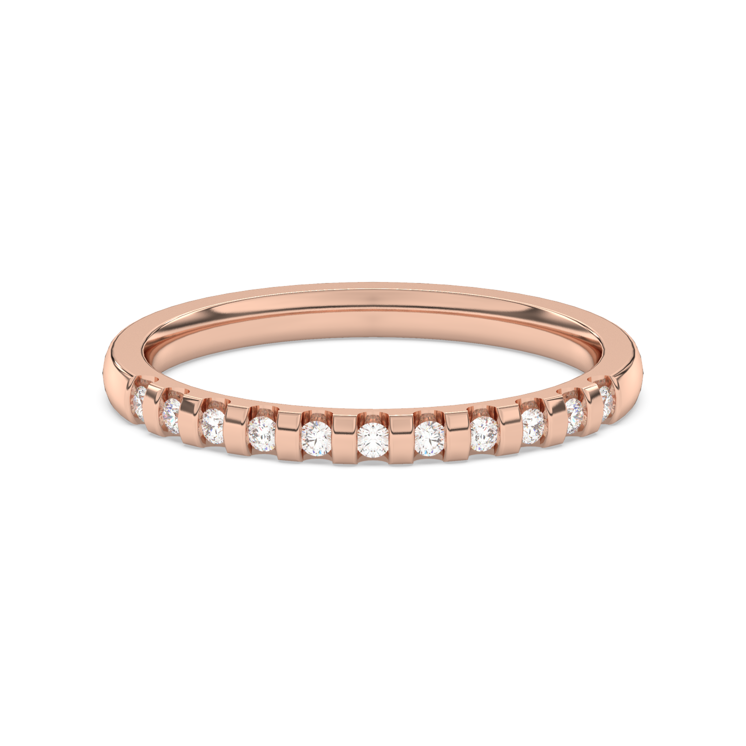 A classic wedding ring with numerous diamonds arranged at intervals.