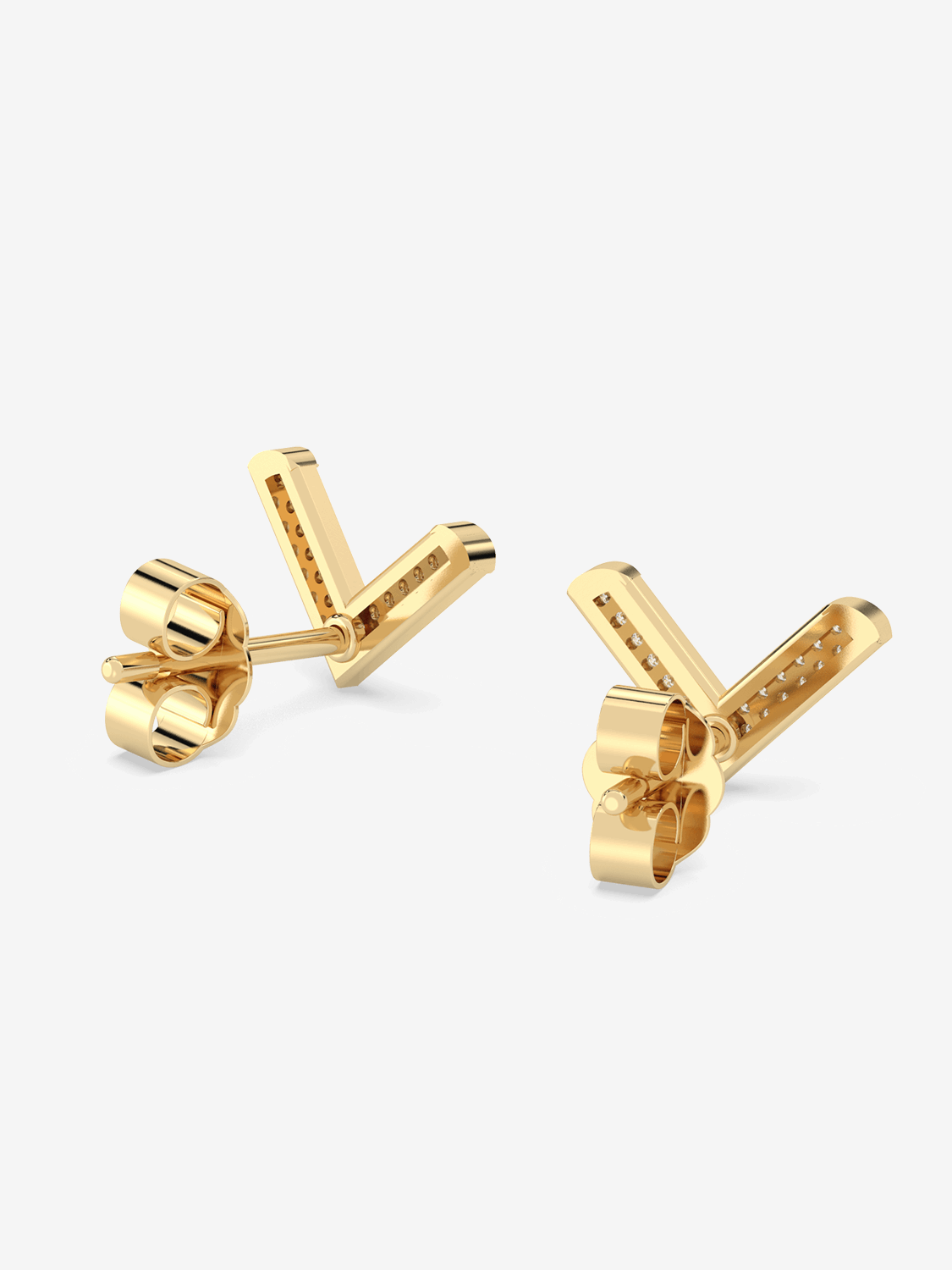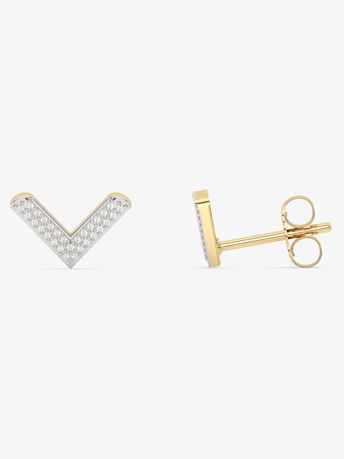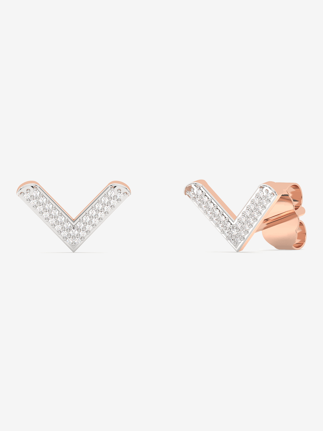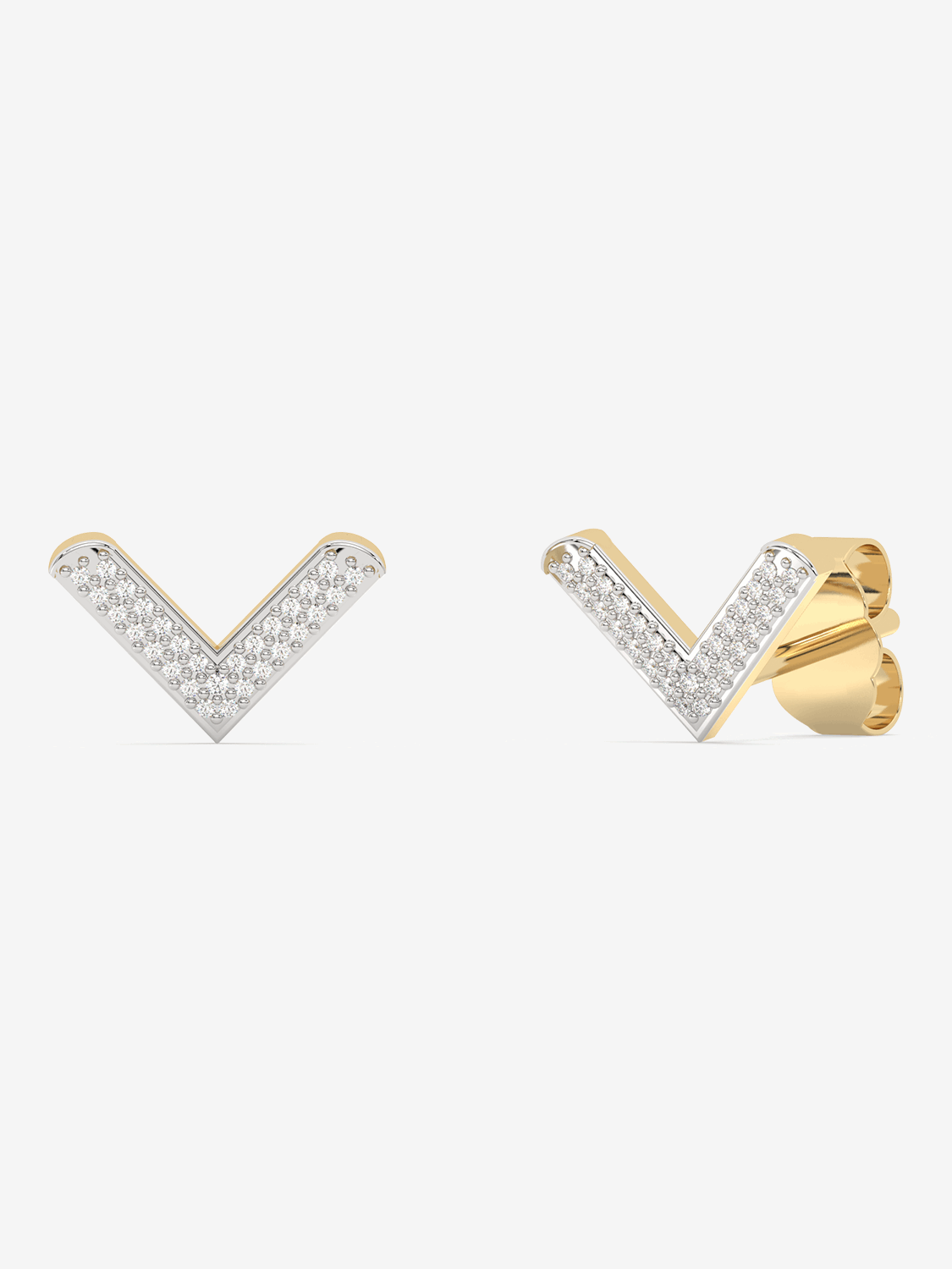 Dazzling V-shaped stud earrings, completely covered with round-cut diamonds. A matching necklace is also available to complement this striking collection.