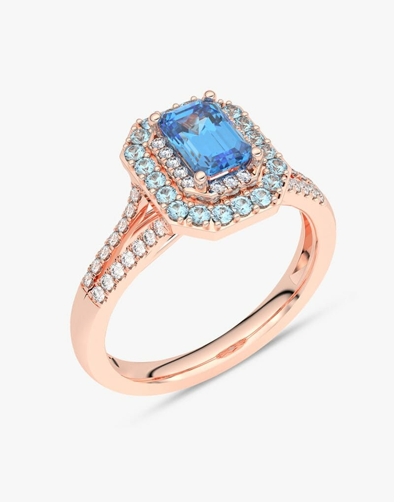 Pierścionek z niebieskim topazem i brylantami w różowym złocie, elegancki i stylowy