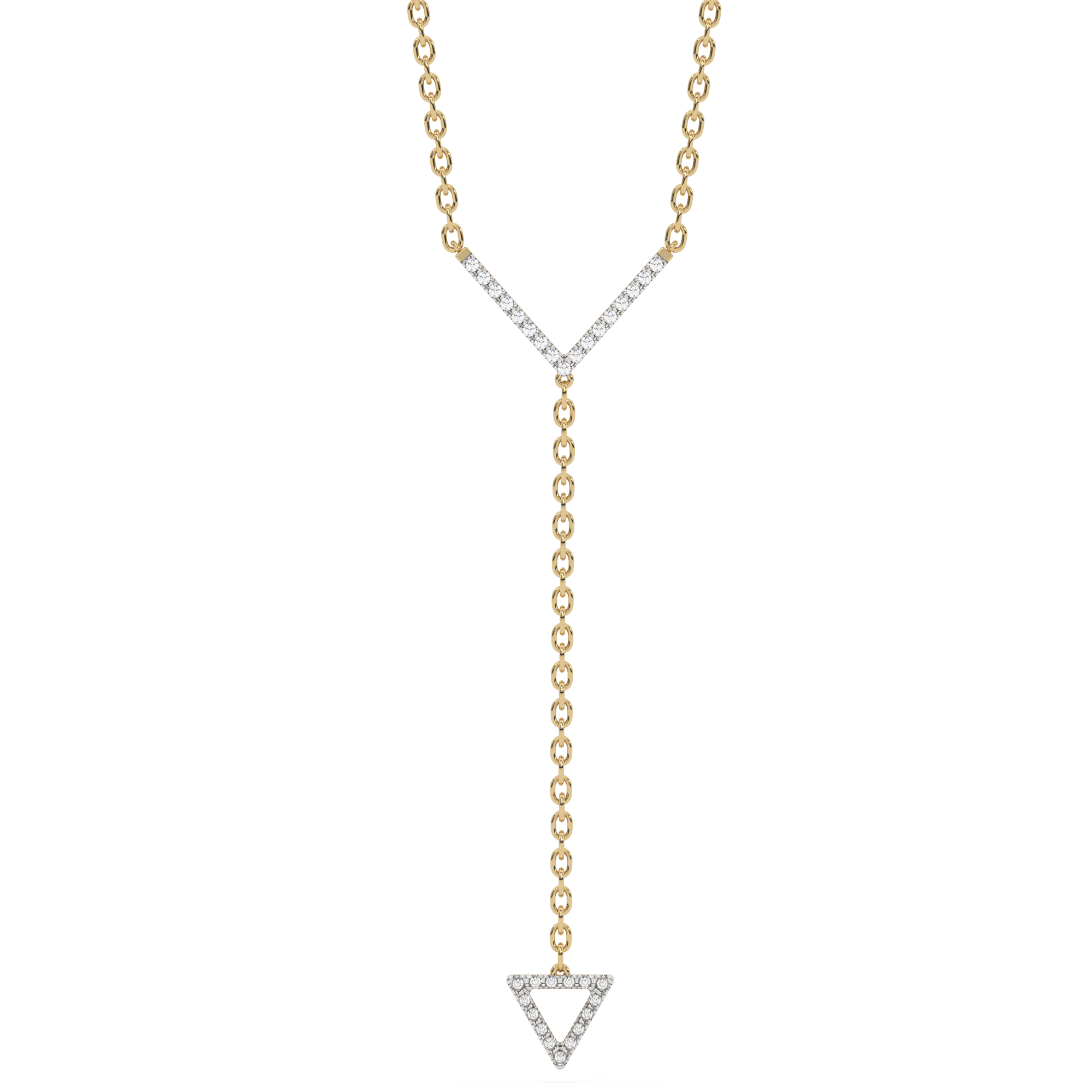 These elegant gold V-shaped necklaces attract attention with their subtlety and sparkle. Decorated with small, shiny stones resembling diamonds, they create a spectacular line from which a thin gold chain hangs, ending with a triangular accent. This is also set with small stones, which adds a unique charm to the whole. Perfect for everyday wear and special occasions.