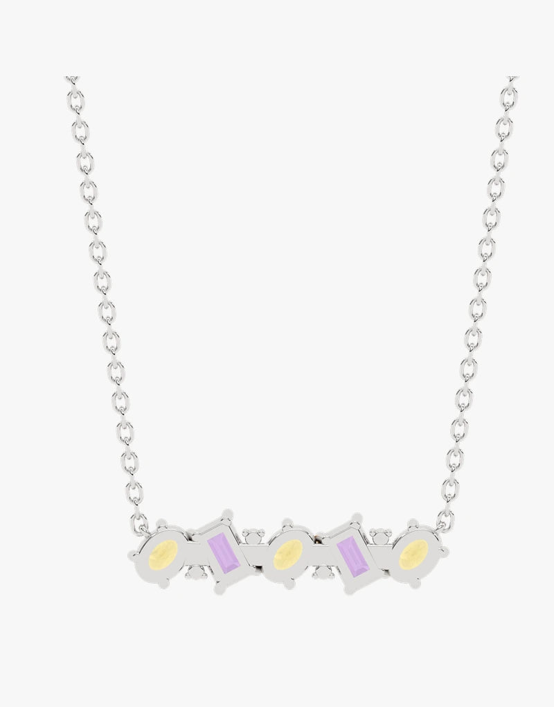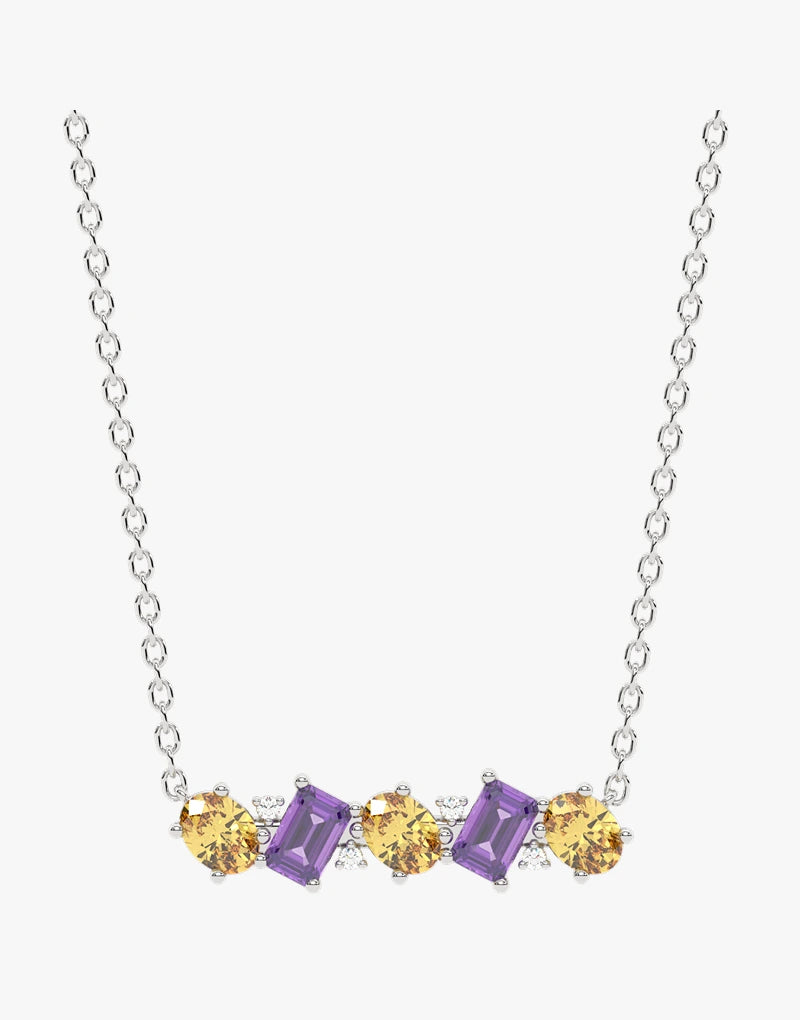 Discover the magic of elegance with our unique necklace, which combines the intense purple of amethysts, the fiery brilliance of spessartites, and the subtle sparkle of diamonds. Each stone has been carefully selected to create a harmonious composition that attracts the eye and exudes luxury. The amethysts, ranging from deep purple to delicate lavender, contrast beautifully with the warm tones of the spessartites, while the diamonds add a subtle sparkle. This necklace is the perfect choice for those seeking to express their style in an elegant way. No matter the occasion, its unique design will add elegance and individuality to any outfit. Immerse yourself in a world of luxury and indulge in a touch of sparkle with this extraordinary necklace.