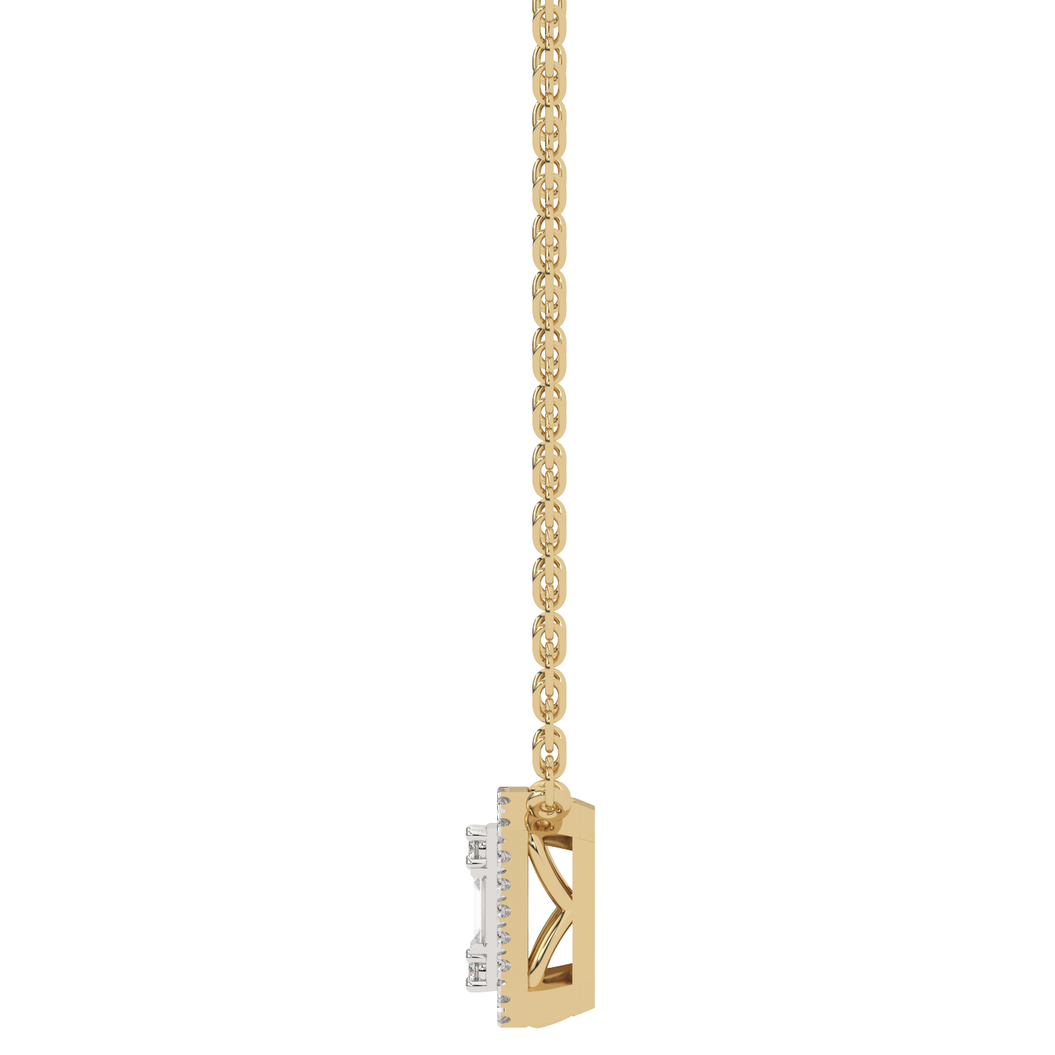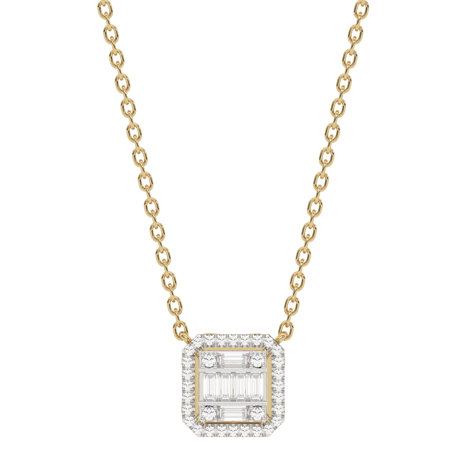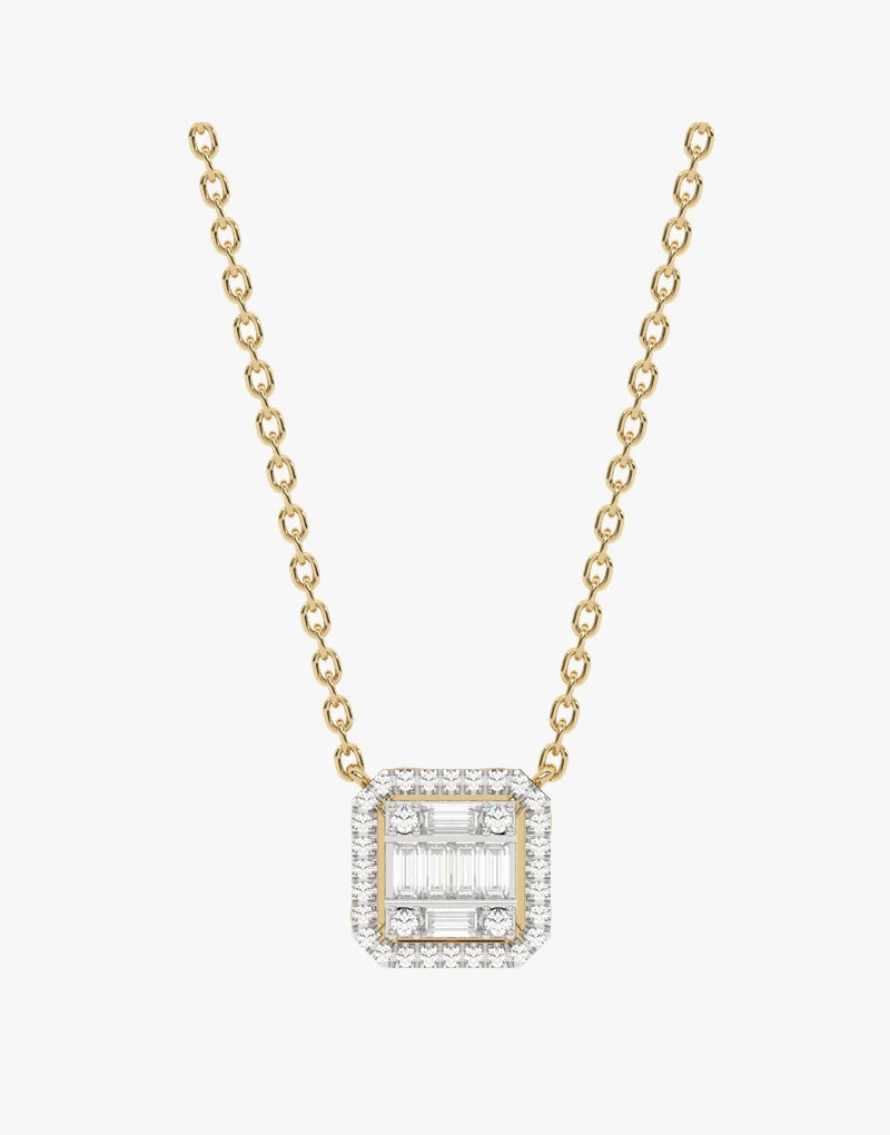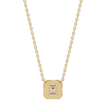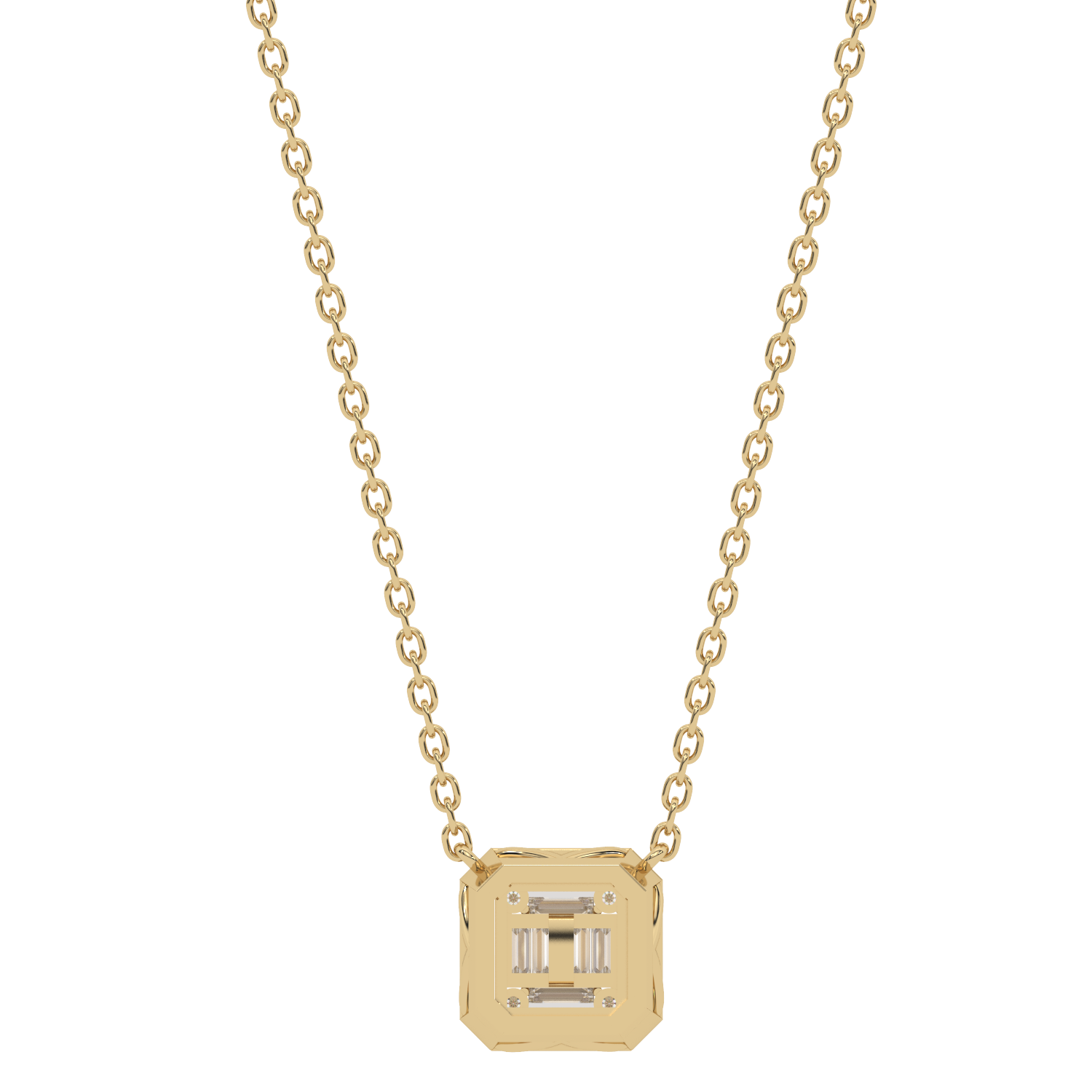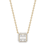 Discover the modern elegance of this unique geometric gold necklace. Set with six stunning baguette-cut diamonds, the necklace draws the eye with its harmonious composition. The brilliant rectangles are perfectly arranged in a square pattern, creating a modern and stylish accent. Surrounded by 32 single-cut diamonds, it adds brilliance and a subtle spark, emphasizing the geometric shape.
