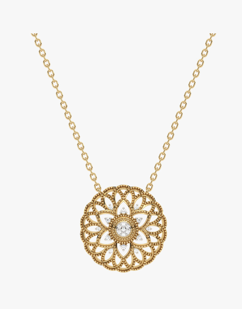 Gold necklace with filigree mandala motif and diamonds