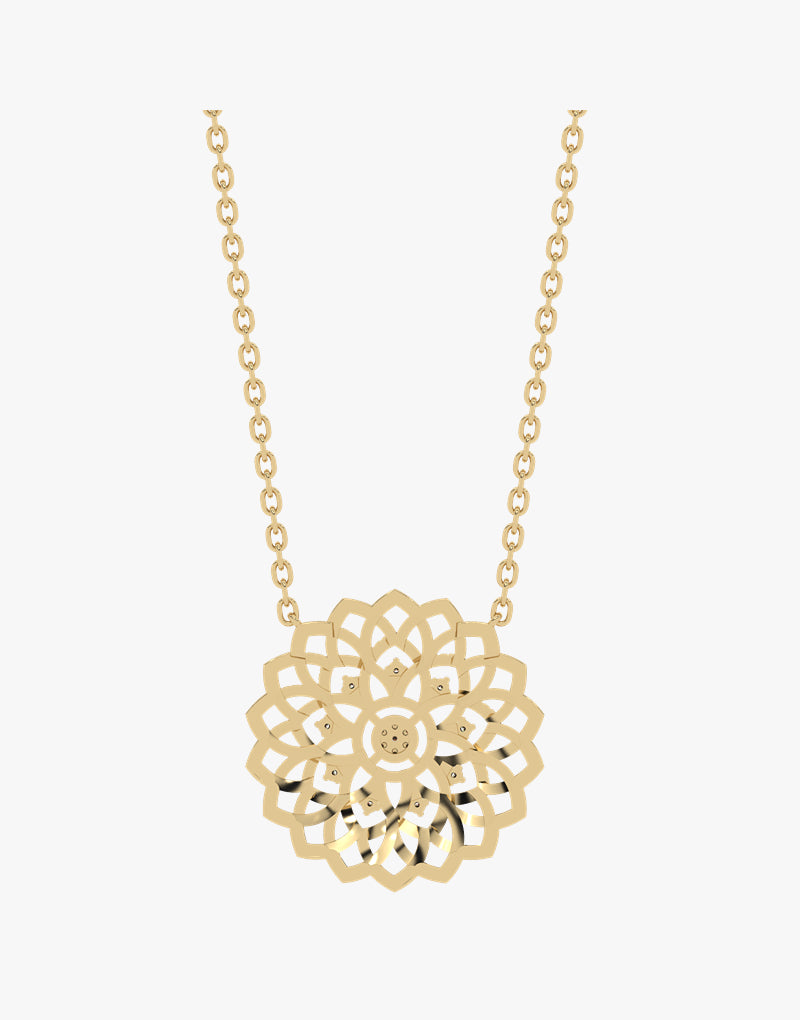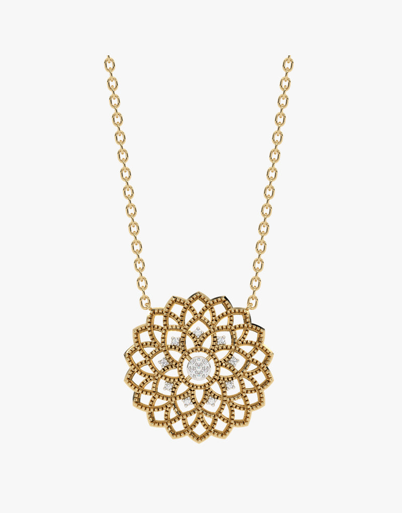 This gold necklace with a stunning floral pendant exudes elegance and delicacy. Made of thin, interwoven gold lines and beaded details, it creates a complex motif resembling a mandala. Small, sparkling diamonds adorn the center and points of the pattern, introducing a subtle sparkle that emphasizes the sophistication of the necklace. A perfect choice for those who appreciate luxury in a subtle way.