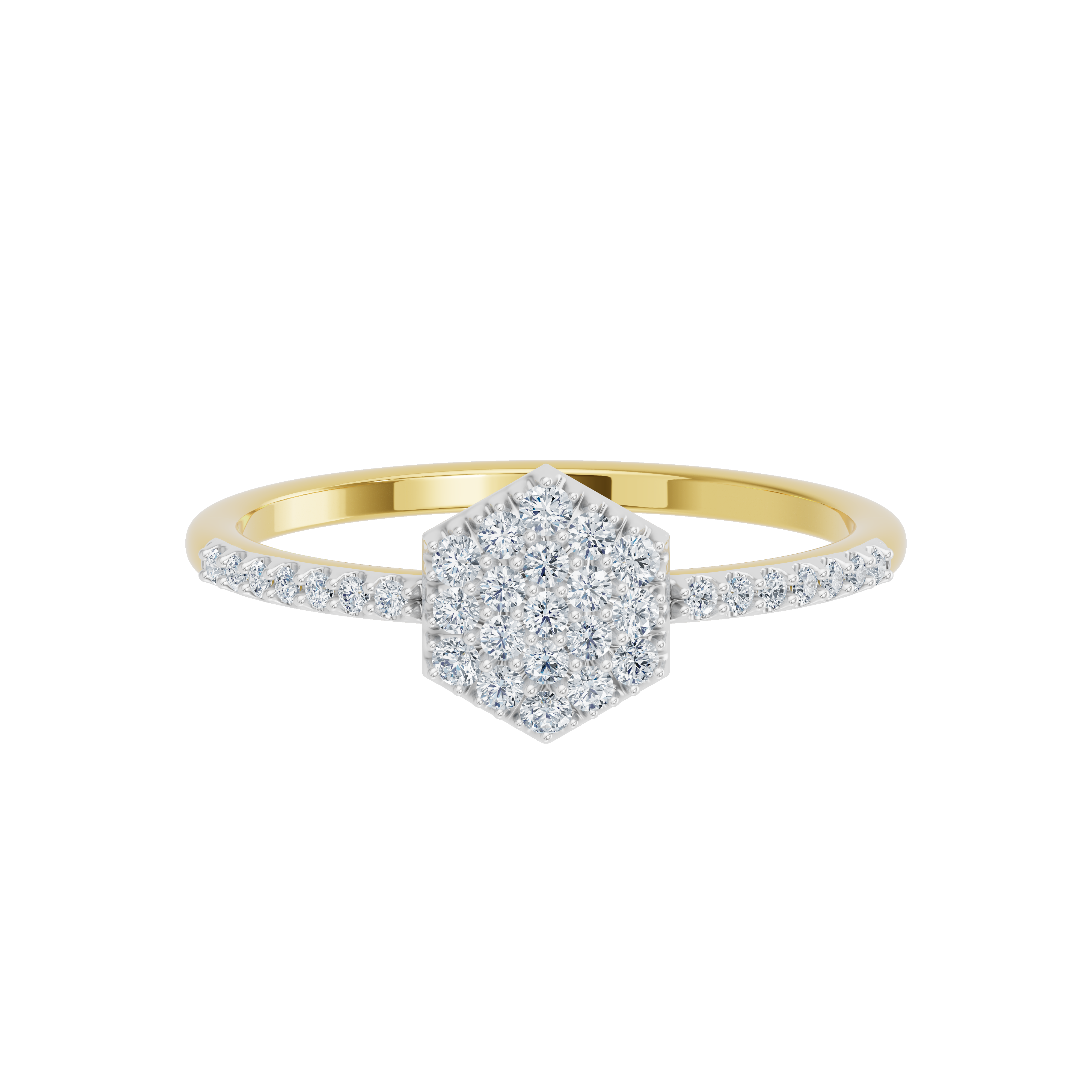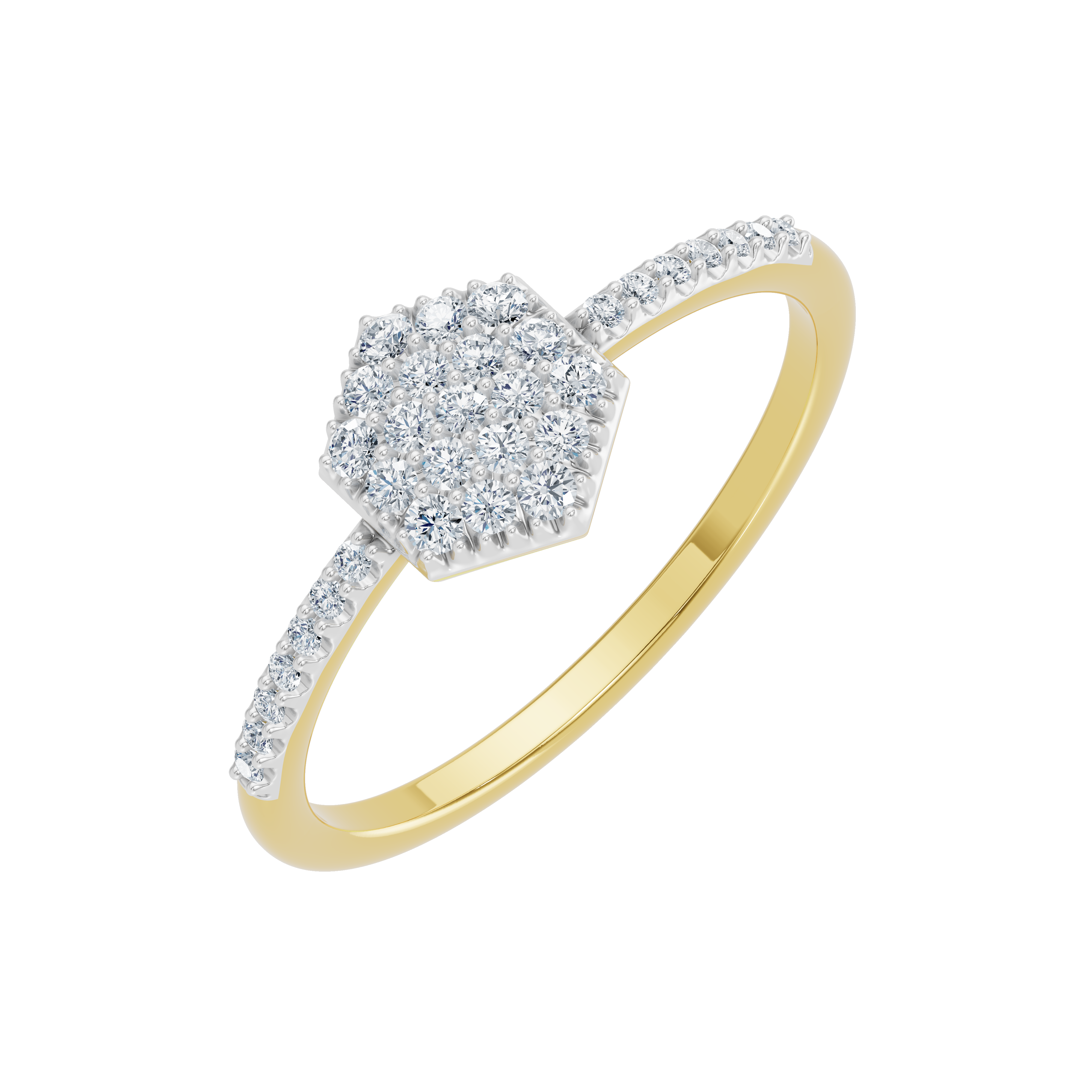 Złoty pierścionek z brylantami w kształcie sześciokąta z delikatnymi zdobieniami