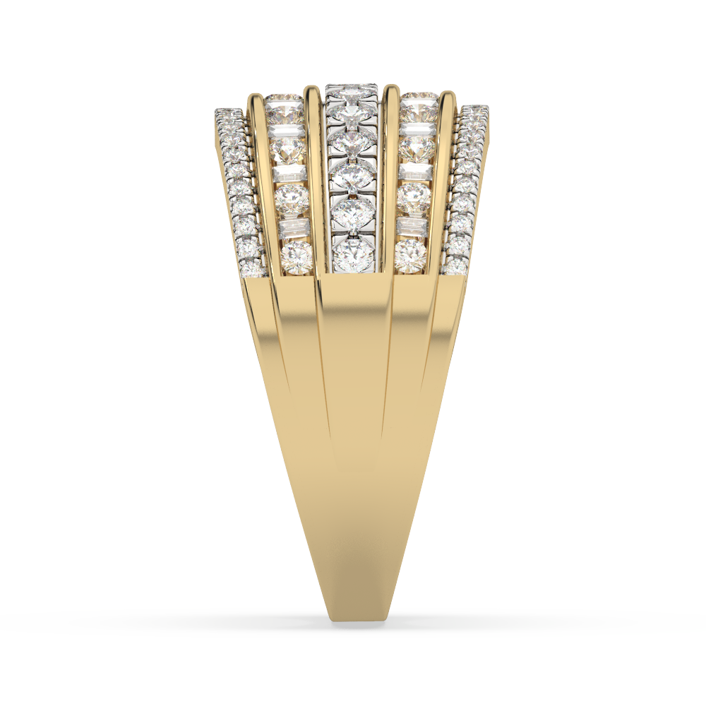 This gold ring in an impressive, multi-row setting is a piece of jewelry that captivates with its grandeur and extraordinary brilliance. Brilliant-cut, round-cut, and baguette-cut diamonds create a harmonious composition, in which every detail emphasizes the luxurious character of the whole. This exceptional ring will be a dazzling accessory for everyday wear and special occasions.