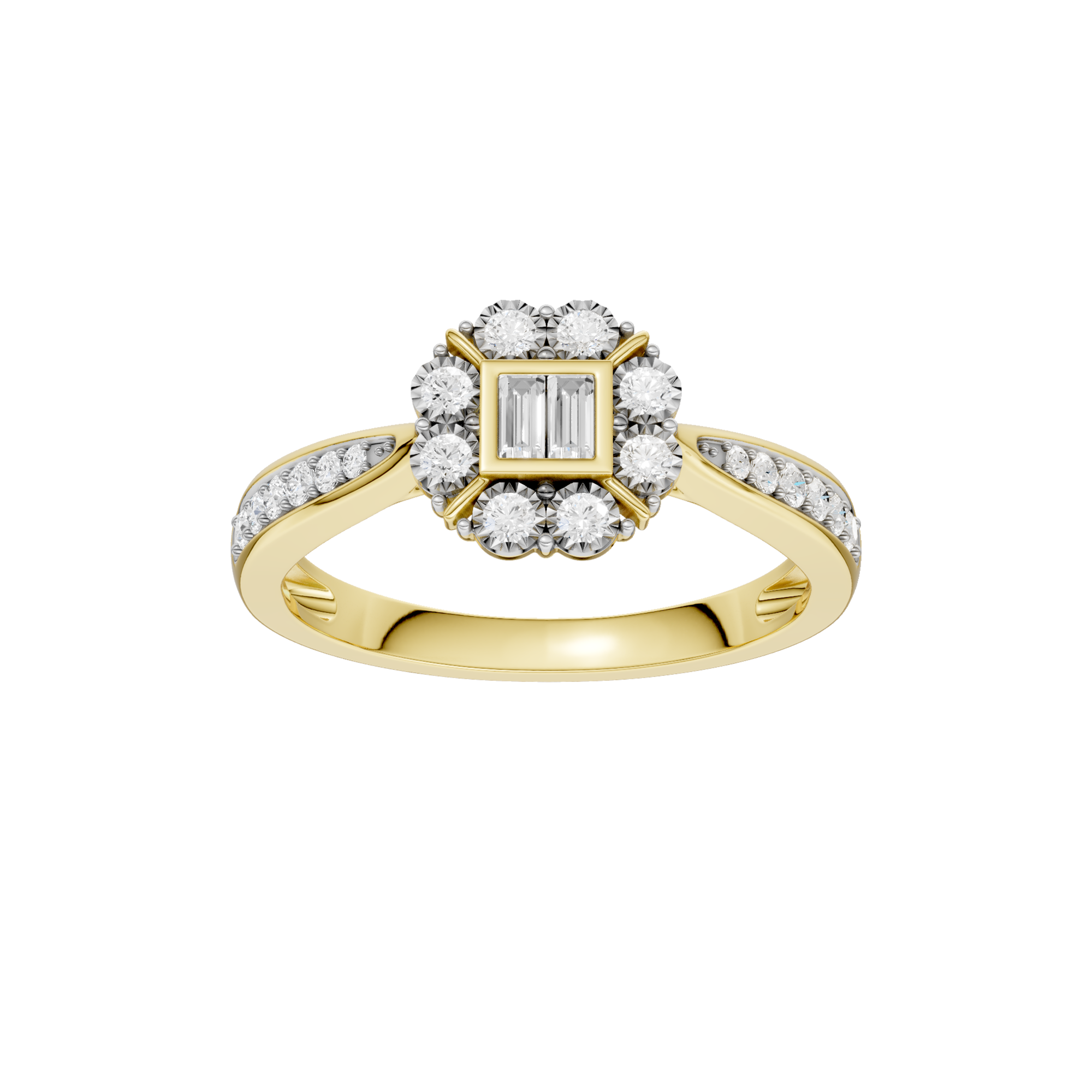 This stunning .585 yellow gold ring combines modern geometry with classic brilliance. The centerpiece features a trio of baguette-cut diamonds set in an elegant rectangle, surrounded by a rosette of smaller round-cut diamonds. The gently flaring band is also set with stones, lending the piece a luxurious and luminous look. A perfect choice for women who appreciate jewelry with refined form and high polish.