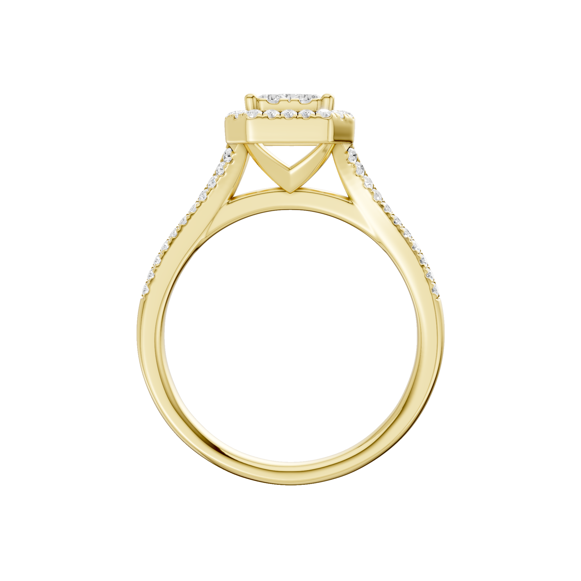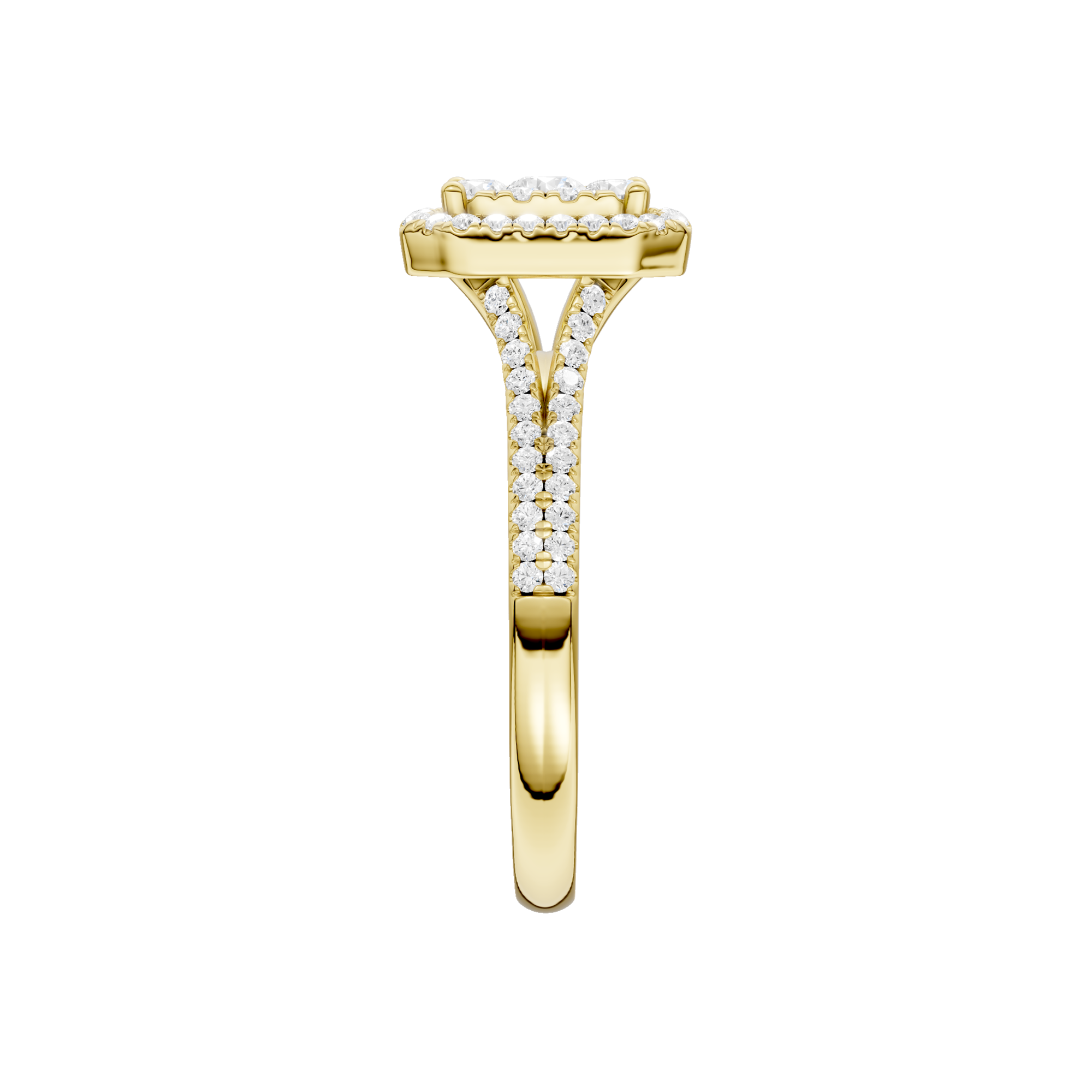This elegant .585 yellow gold ring features a unique composition of diamonds set in a rectangular halo setting. A central mosaic of larger stones draws the eye and adds depth to the piece, while the smaller diamonds surrounding the setting and the diamond-encrusted band add sparkle and sophistication. This ring is perfect for women who appreciate style, geometry, and dazzling detail—the perfect engagement ring or a meaningful gift.