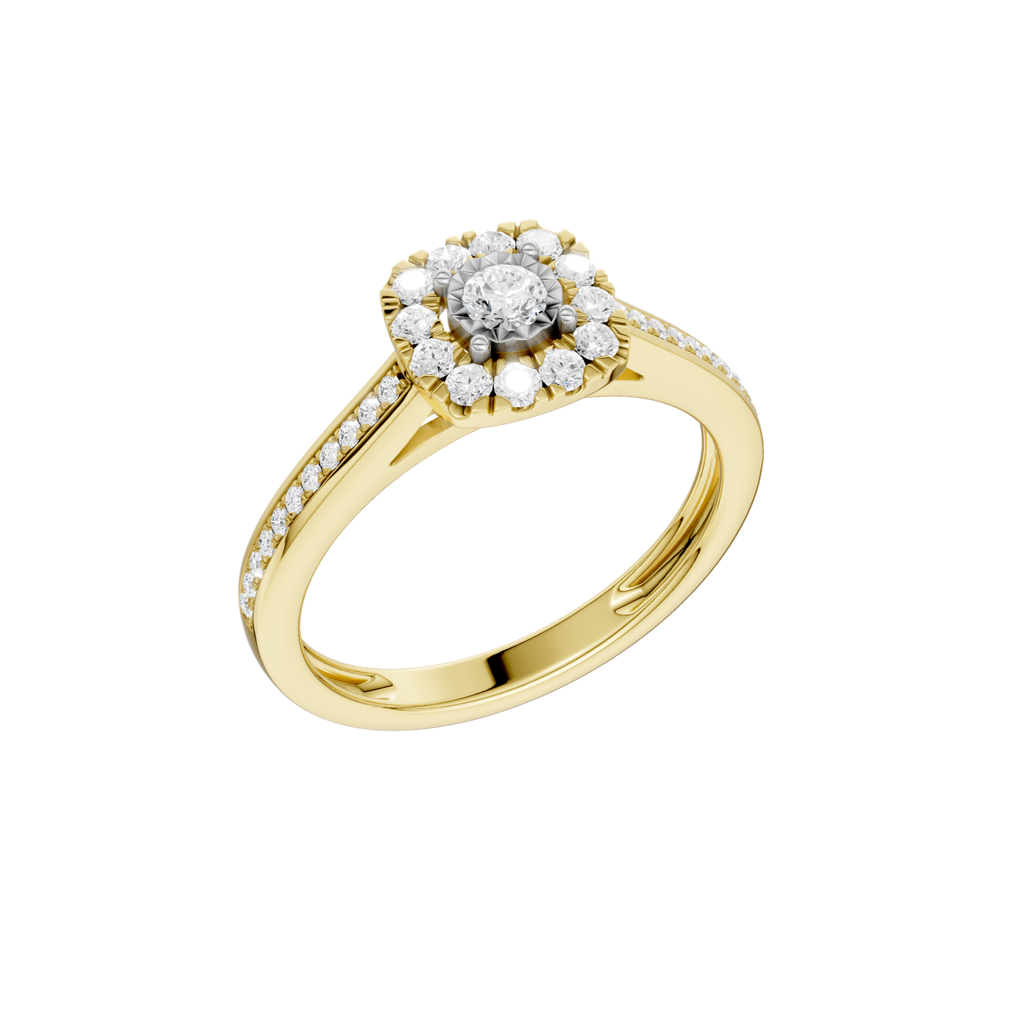 Złoty pierścionek z brylantami o kwiatowym kształcie i subtelnych detalach diamentowych