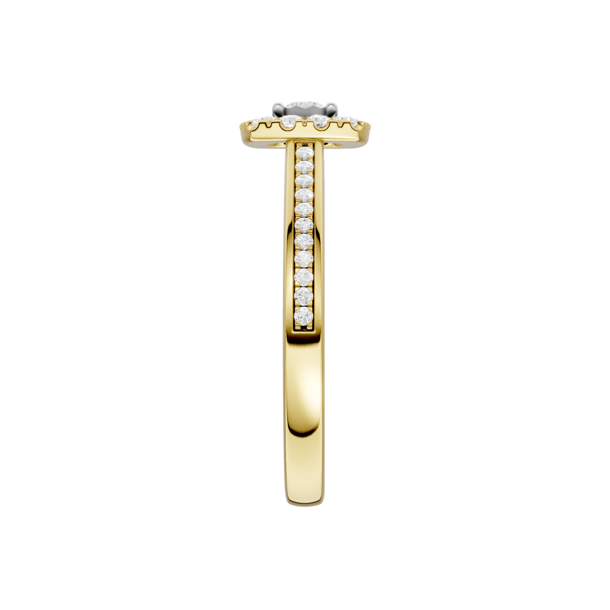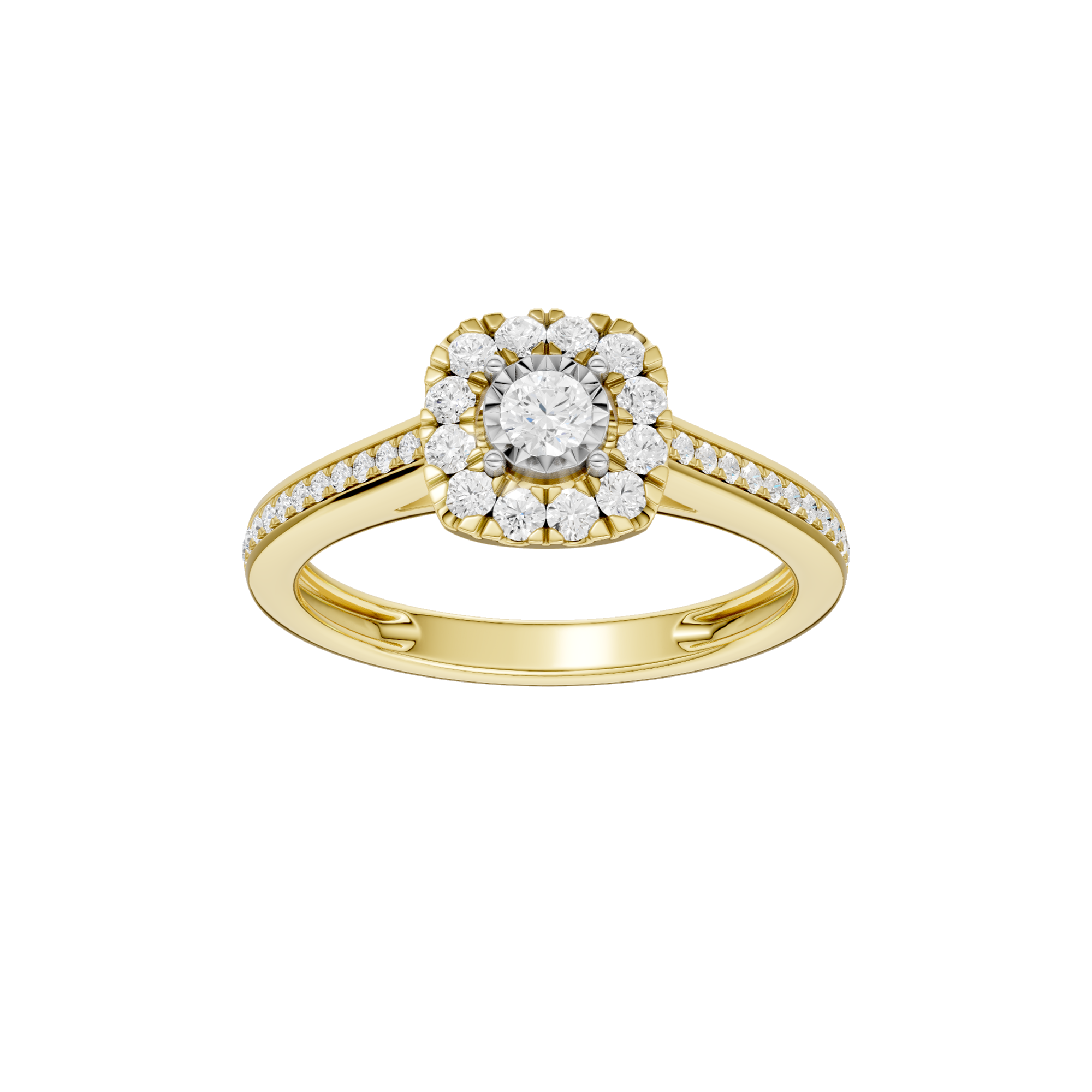 This dazzling .585 yellow gold ring is a harmonious blend of classic and modern. The central diamond is set in an elegant, rectangular halo-shaped crown of smaller stones, enhancing its brilliance and lending the piece a distinctive character. The slender, delicate band, additionally adorned with diamonds, lends the ring a lightness and subtle elegance. A perfect choice for an engagement or as a unique symbol of love.