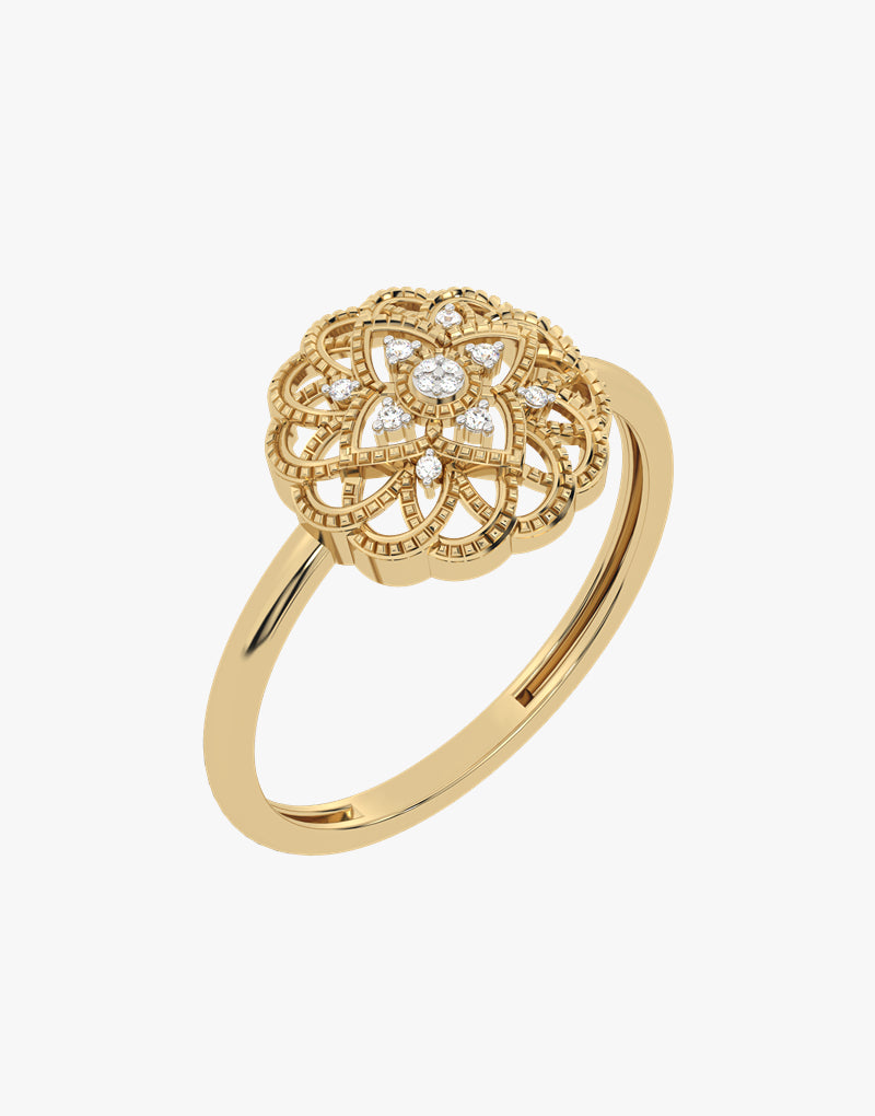 This gold ring combines classic and elegant with its central flower motif, set with sparkling diamonds. The precise details of the filigree work give it a unique character, while the simple gold band makes it a great choice for special occasions.