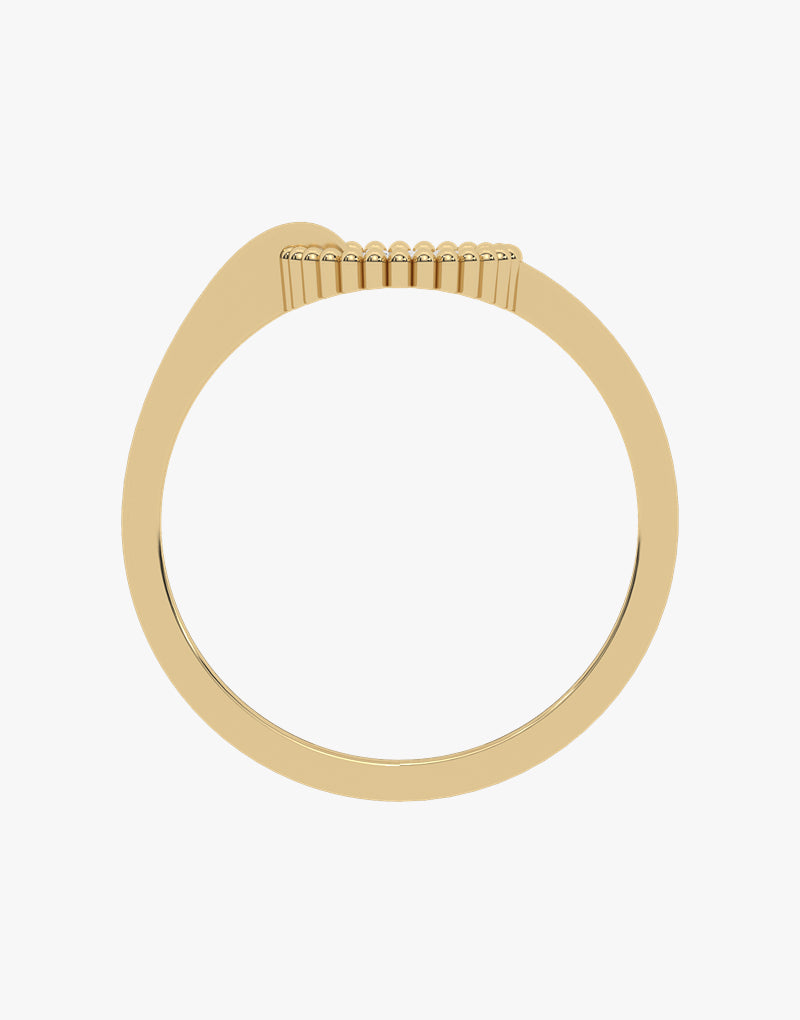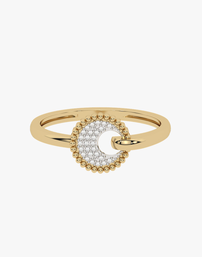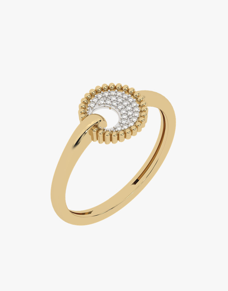 An elegant ring made of gold, decorated with sparkling diamonds in a round pave pattern. It has a unique, curved motif connecting the disc to the band, adding a modern character. The perfect choice for subtle and stylish jewelry.