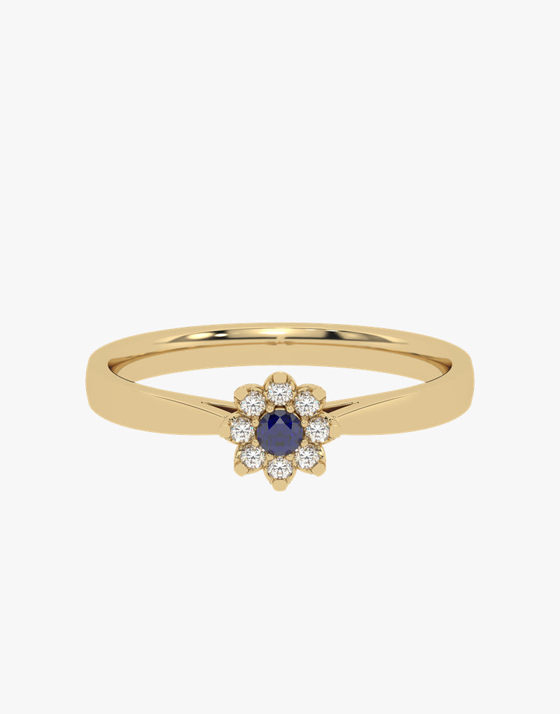 Delikatny złoty pierścionek z szafirem i diamentami w kształcie kwiatka od Venetia Jewels