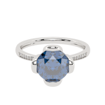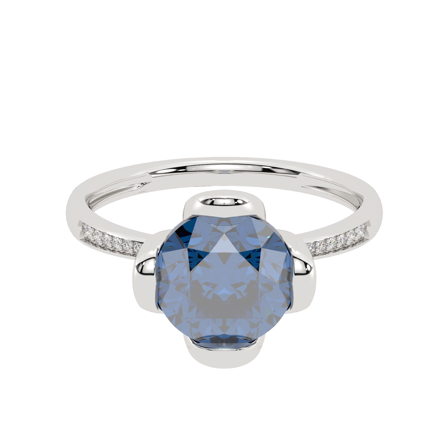 Discover timeless brilliance and elegance with our unique ring that combines dazzling London blue topaz and diamonds. The central, round London blue topaz weighing an impressive 3.20 ct captivates with its deep, intense shade of blue that catches the eye and adds a unique charm to any hand. Surrounded by 19 single-cut diamonds, this ring exudes luxury and subtle sparkle.