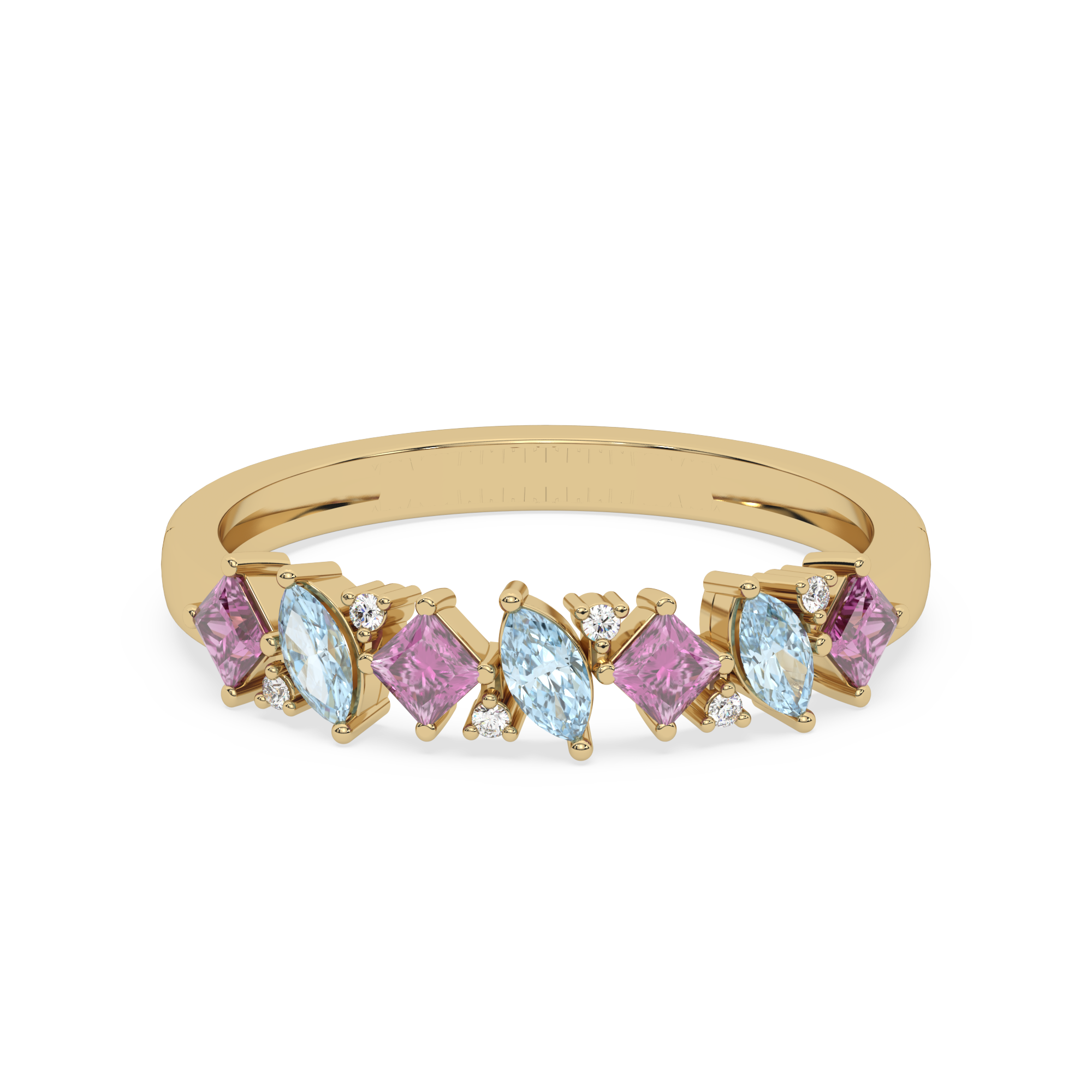 This gold ring captivates with its lightness and richness of color, perfect for women who value subtle elegance with a touch of luxury. The composition is adorned with a harmonious combination of marquise-cut blue topaz and square-cut pink-purple rhodium, creating a unique interplay of colors – fresh, radiant, and profound. Sparkling diamonds complement the design, illuminating the ring and emphasizing its exclusive character. This piece pairs beautifully with both everyday and evening wear.