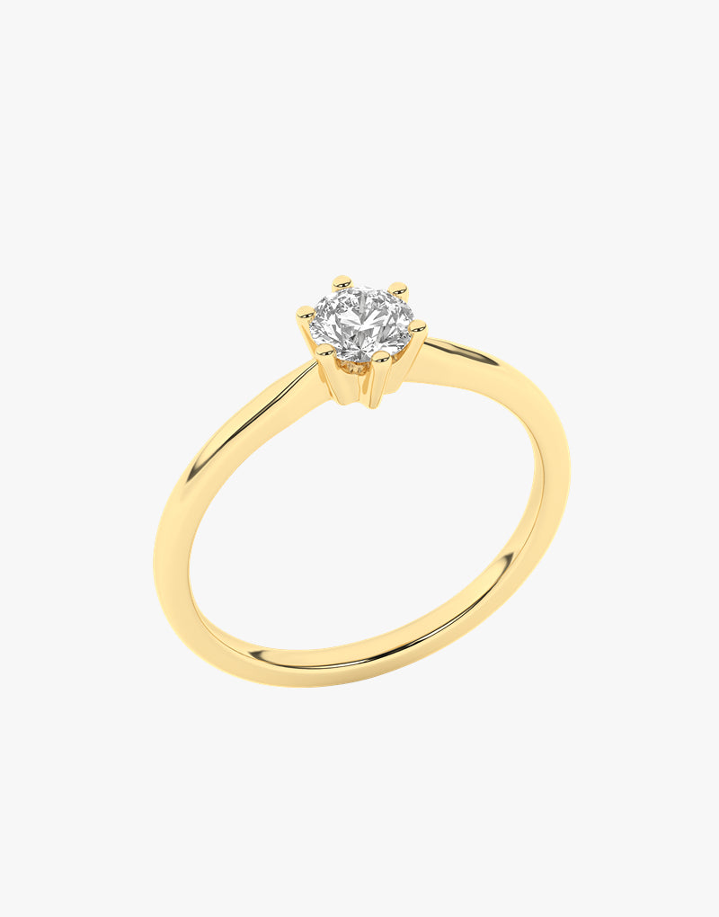 This elegant gold engagement ring features a beautiful, cut diamond set in a delicate six-point setting. The classic design and exceptional sparkle of the diamond make it the perfect expression of love and commitment.