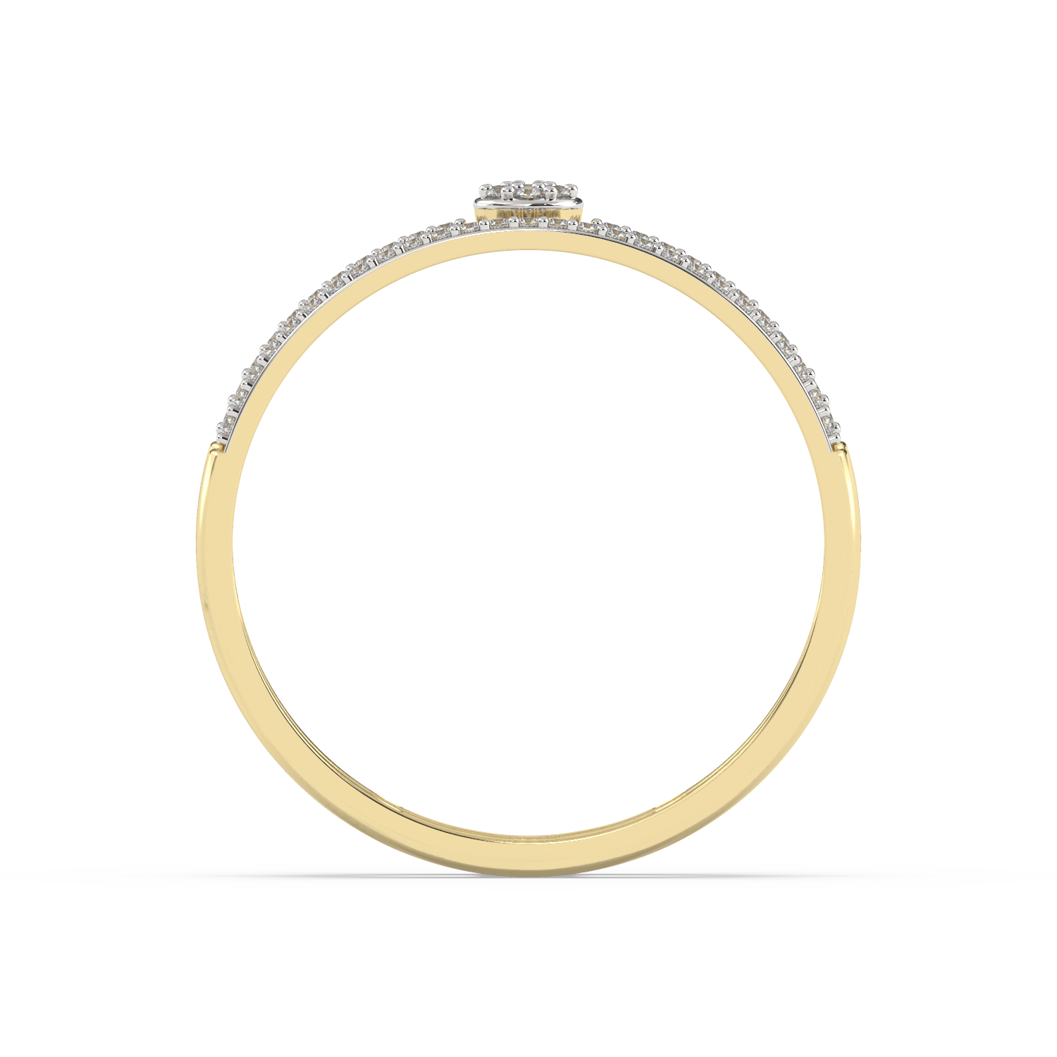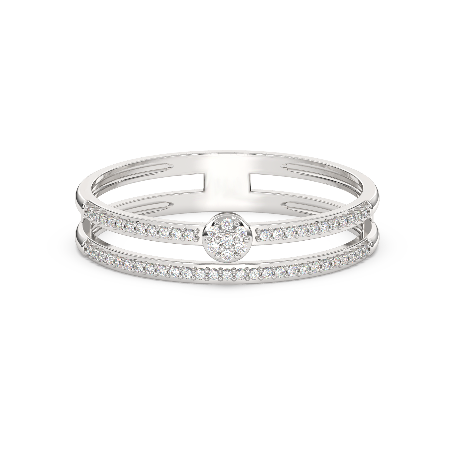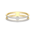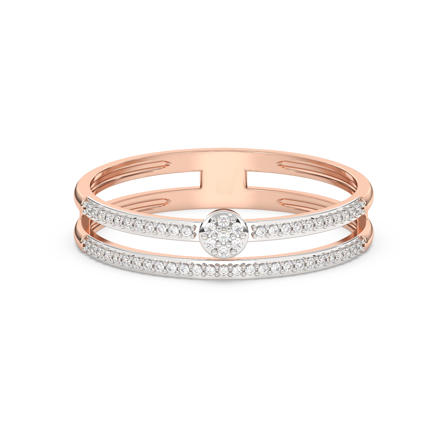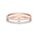 Obrączka z podwójnym paskiem brylantów – jeden pół-pasek na górze, jeden pół-pasek na dole wraz z okrągłymi brylantami w centrum.