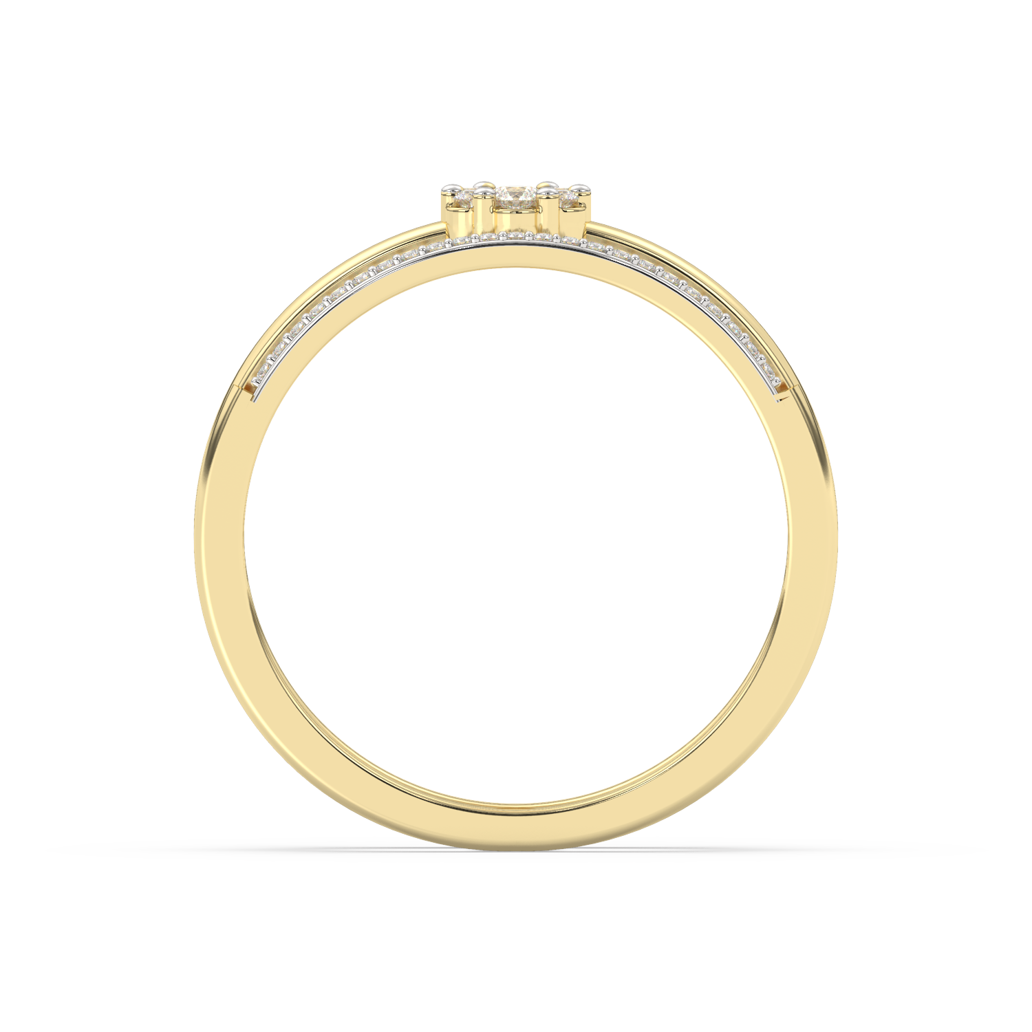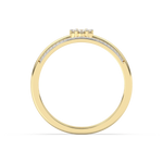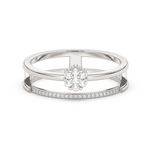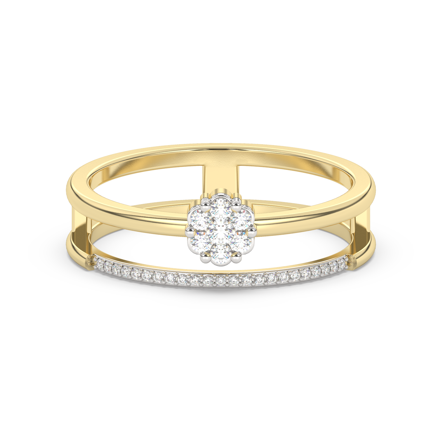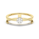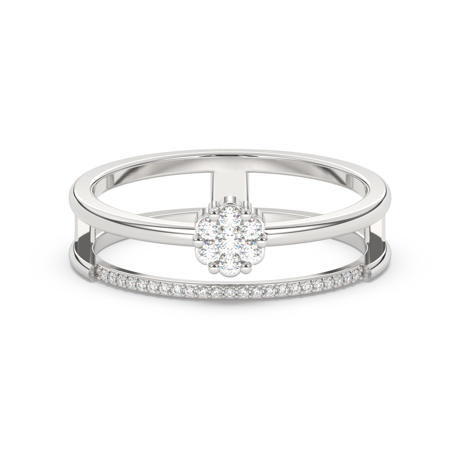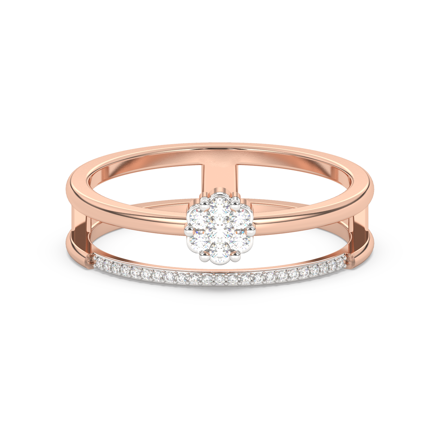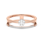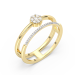 Podwójny pierścionek, na górnej obrączce brylant w kształcie kwiatu umieszczony centralnie, na dolnej obrączce pasek brylantów.
