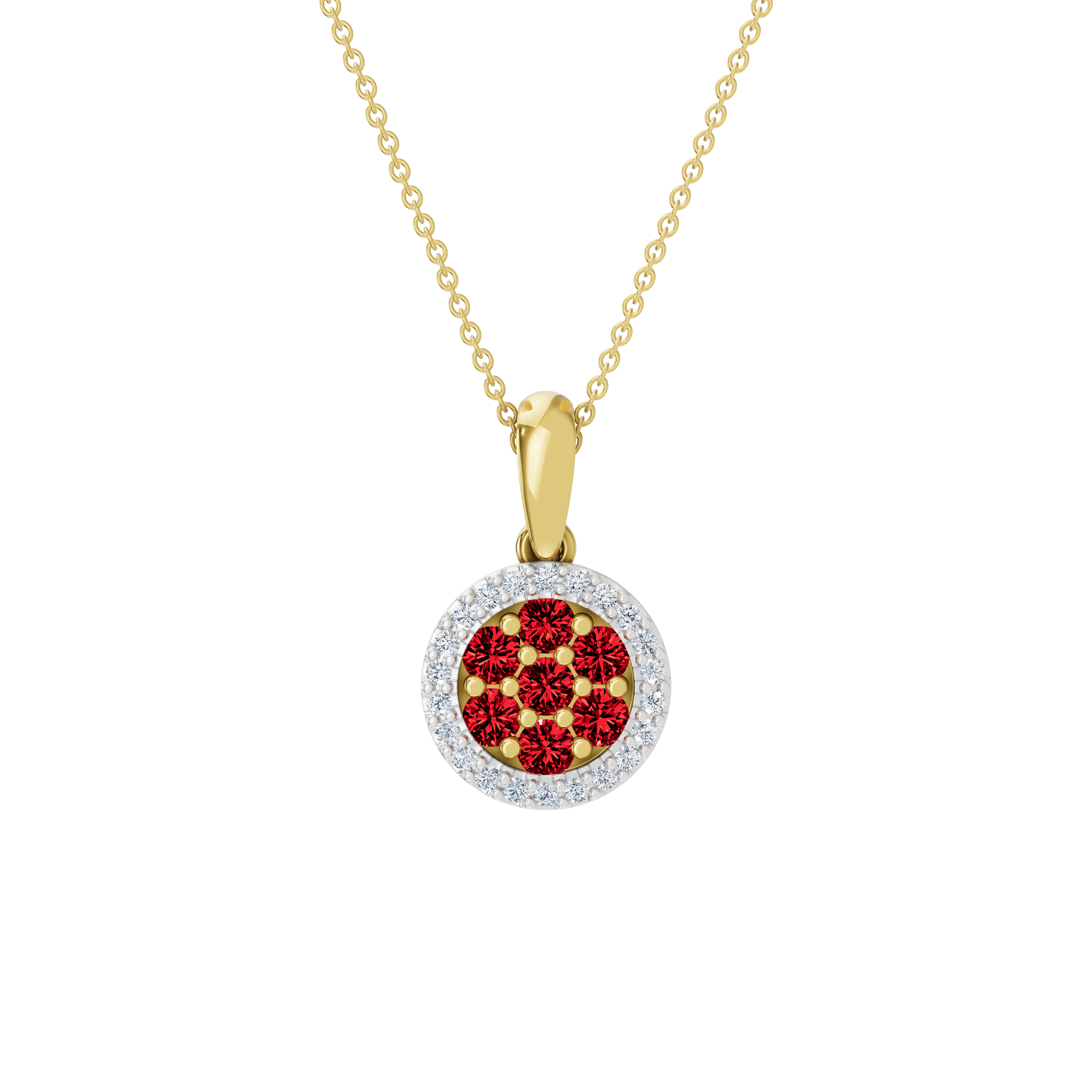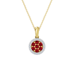 Wyjątkowa złota zawieszka o klasycznej, okrągłej formie, która zachwyca kontrastowym połączeniem intensywnie czerwonych rubinów z blaskiem brylantów. Centralna kompozycja z rubinów tworzy elegancką rozetę, podkreśloną jasną obwódką z brylantów, nadając biżuterii wyrazistości, głębi oraz luksusowego charakteru. To doskonały wybór dla kobiety ceniącej kolorowe kamienie szlachetne i ponadczasową elegancję, idealny zarówno na co dzień, jak i na wyjątkowe okazje. Łańcuszki sprzedawane oddzielnie.