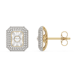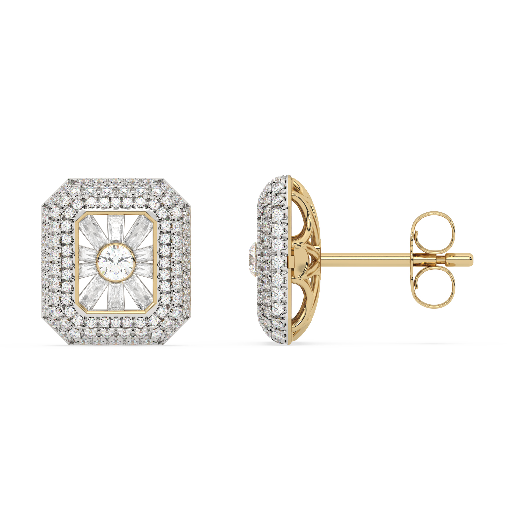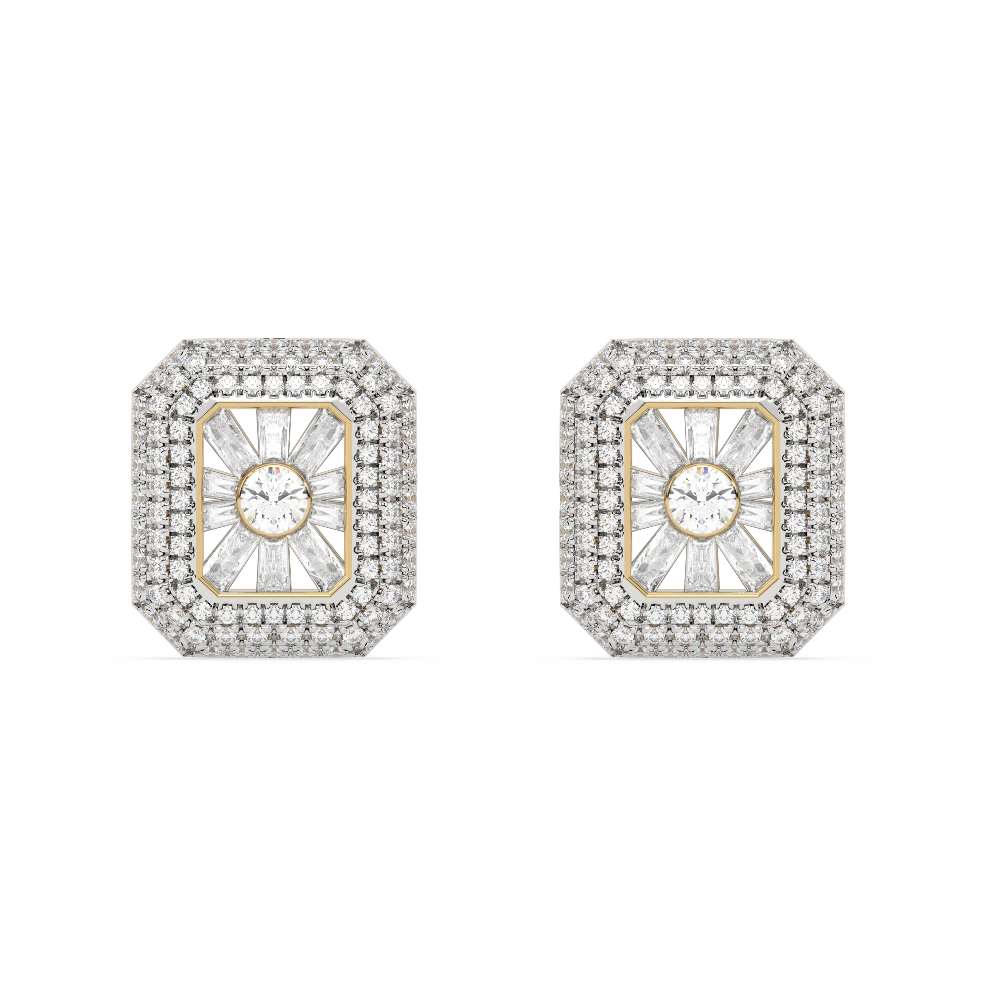 Złote kolczyki o geometrycznej formie zachwycają elegancją i wyjątkowym blaskiem. Centralny brylant otoczony jest kompozycją kamieni o szlifie bagietkowym oraz uzupełniony brylantami o szlifie brylantowym i okrągłym, które razem tworzą efekt świetlistej, wielowarstwowej aureoli. To luksusowa biżuteria, która pięknie rozświetli każdą stylizację i podkreśli kobiecy wdzięk.
