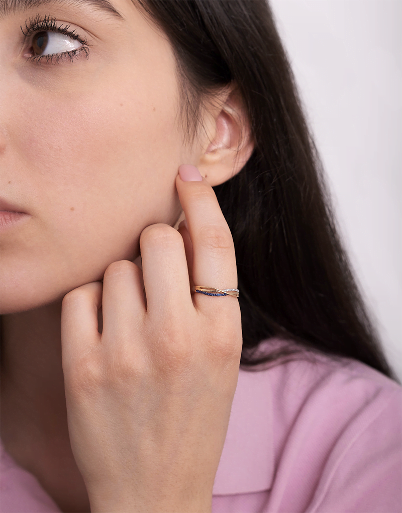 Złoty pierścionek z szafirami na palcu modelki w bluzce różowej
