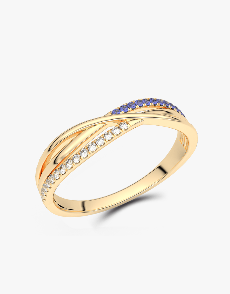 Złoty pierścionek z szafirami o eleganckim, skręconym designie z diamentowymi akcentami
